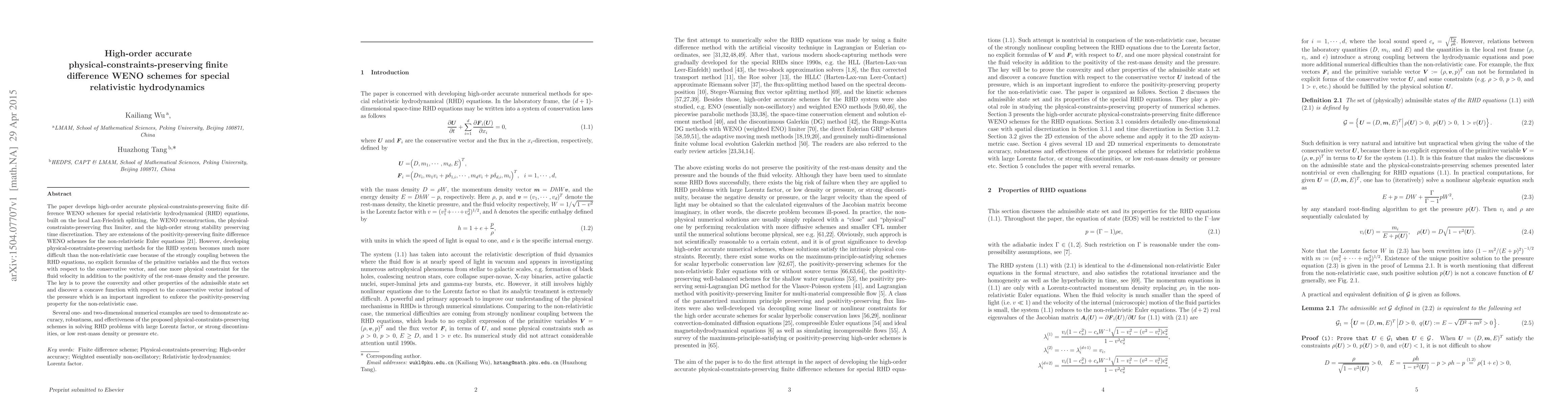 The paper introduces high-order accurate finite difference WENO schemes for solving special relativistic hydrodynamics equations while preserving physical constraints, using advanced techniques for stability and accuracy. The schemes demonstrate effectiveness in handling strong discontinuities and low densities through numerical examples.
