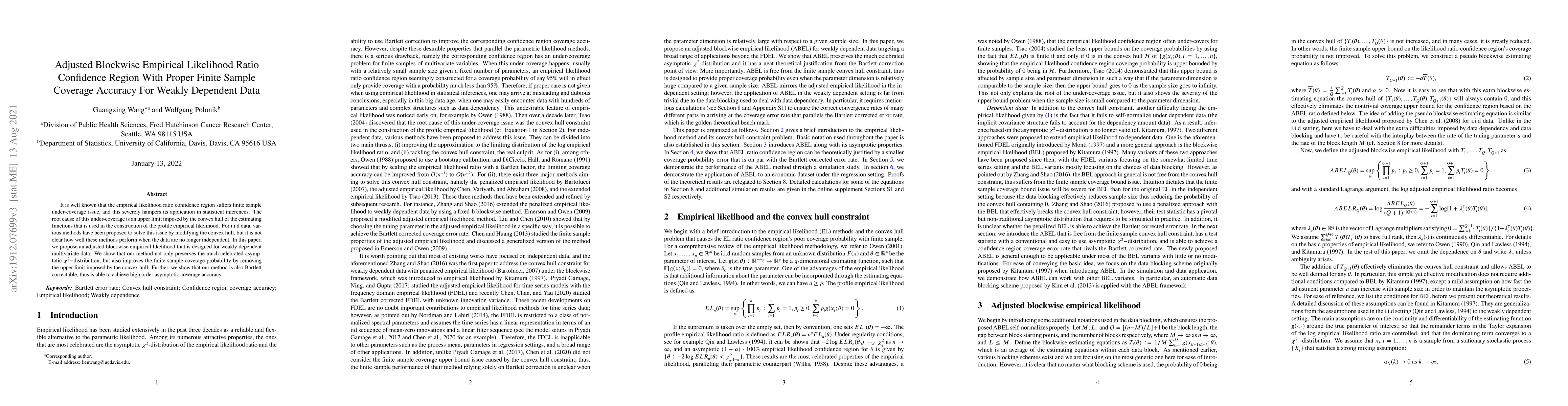 Researchers propose a new method for empirical likelihood, improving coverage in weakly dependent data with high order asymptotic accuracy. The adjusted blockwise empirical likelihood preserves the $\chi^2-$distribution and improves finite sample coverage.