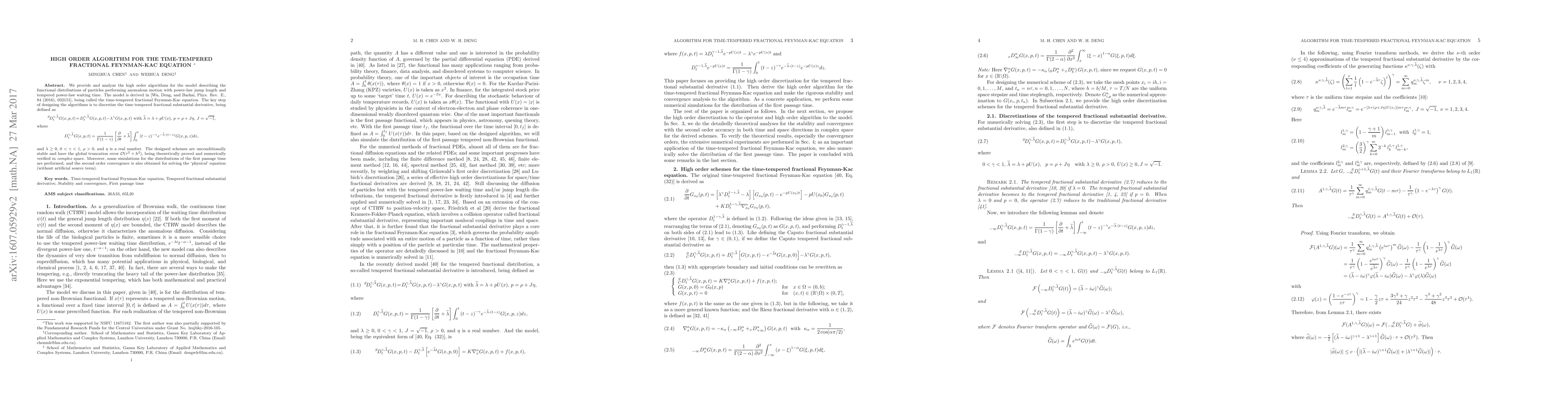 We provide and analyze the high order algorithms for the model describing the functional distributions of particles performing anomalous motion with power-law jump length and tempered power-law waiting time. The model is derived in [Wu, Deng, and Barkai, Phys. Rev. E., 84 (2016), 032151], being called the time-tempered fractional Feynman-Kac equation. The key step of designing the algorithms is to discretize the time tempered fractional substantial derivative, being defined as $${^S\!}D_t^{\gamma,\widetilde{\lambda}} G(x,p,t)\!=\!D_t^{\gamma,\widetilde{\lambda}} G(x,p,t)\!-\!\lambda^\gamma G(x,p,t) ~{\rm with}~\widetilde{\lambda}=\lambda+ pU(x),\, p=\rho+J\eta,\, J=\sqrt{-1},$$ where $$D_t^{\gamma,\widetilde{\lambda}} G(x,p,t) =\frac{1}{\Gamma(1-\gamma)} \left[\frac{\partial}{\partial t}+\widetilde{\lambda} \right] \int_{0}^t{\left(t-z\right)^{-\gamma}}e^{-\widetilde{\lambda}\cdot(t-z)}{G(x,p,z)}dz,$$ and $\lambda \ge 0$, $0<\gamma<1$, $\rho>0$, and $\eta$ is a real number. The designed schemes are unconditionally stable and have the global truncation error $\mathcal{O}(\tau^2+h^2)$, being theoretically proved and numerically verified in {\em complex} space. Moreover, some simulations for the distributions of the first passage time are performed, and the second order convergence is also obtained for solving the `physical' equation (without artificial source term).