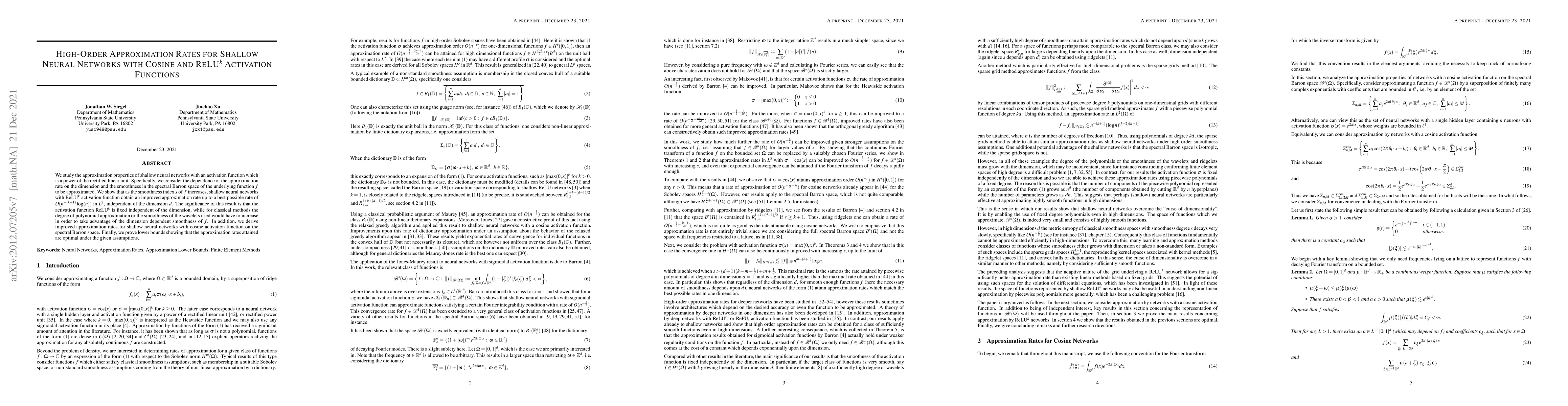 We study the approximation properties of shallow neural networks with an activation function which is a power of the rectified linear unit. Specifically, we consider the dependence of the approximation rate on the dimension and the smoothness in the spectral Barron space of the underlying function $f$ to be approximated. We show that as the smoothness index $s$ of $f$ increases, shallow neural networks with ReLU$^k$ activation function obtain an improved approximation rate up to a best possible rate of $O(n^{-(k+1)}\log(n))$ in $L^2$, independent of the dimension $d$. The significance of this result is that the activation function ReLU$^k$ is fixed independent of the dimension, while for classical methods the degree of polynomial approximation or the smoothness of the wavelets used would have to increase in order to take advantage of the dimension dependent smoothness of $f$. In addition, we derive improved approximation rates for shallow neural networks with cosine activation function on the spectral Barron space. Finally, we prove lower bounds showing that the approximation rates attained are optimal under the given assumptions.