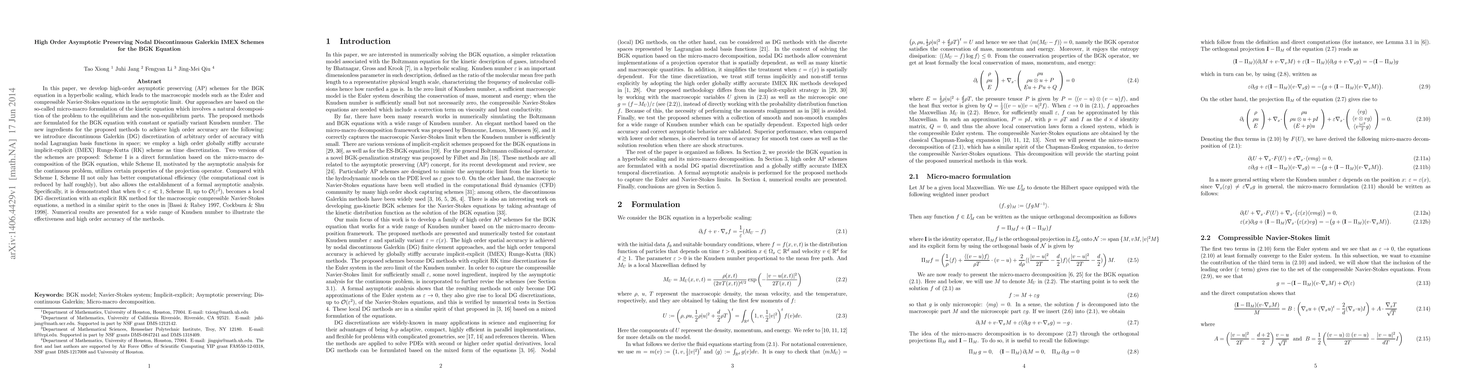 This paper develops high-order asymptotic preserving schemes for the BGK equation, employing discontinuous Galerkin and IMEX Runge-Kutta methods. Two schemes are proposed: Scheme I based on micro-macro decomposition, and Scheme II, which is computationally more efficient and allows formal asymptotic analysis.