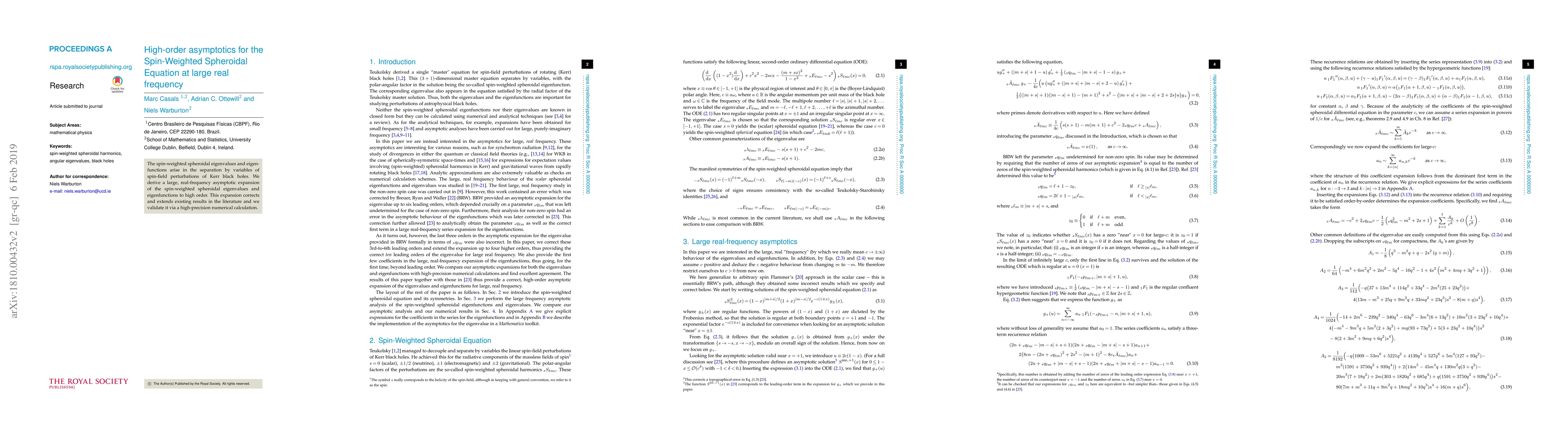 Researchers derive a high-order asymptotic expansion of spin-weighted spheroidal eigenvalues and eigenfunctions for large real frequency in Kerr black hole perturbations, correcting existing results.
