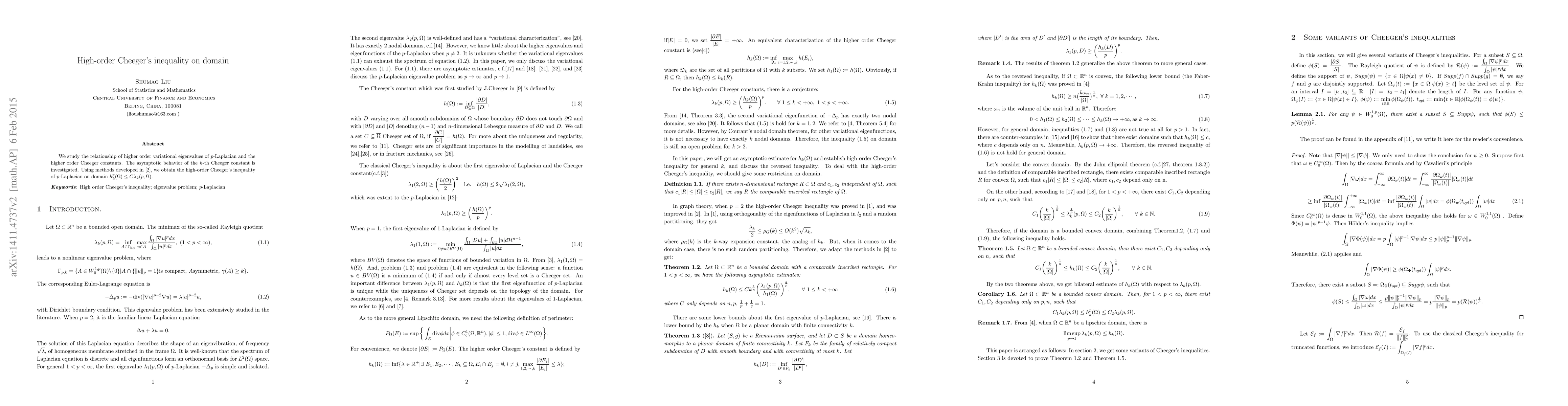 This paper investigates the connection between higher order variational eigenvalues of the p-Laplacian and the k-th Cheeger constants, establishing a high-order Cheeger's inequality through domain decomposition methods relative to eigenfunctions. The study also examines the asymptotic behavior of the k-th Cheeger constant.