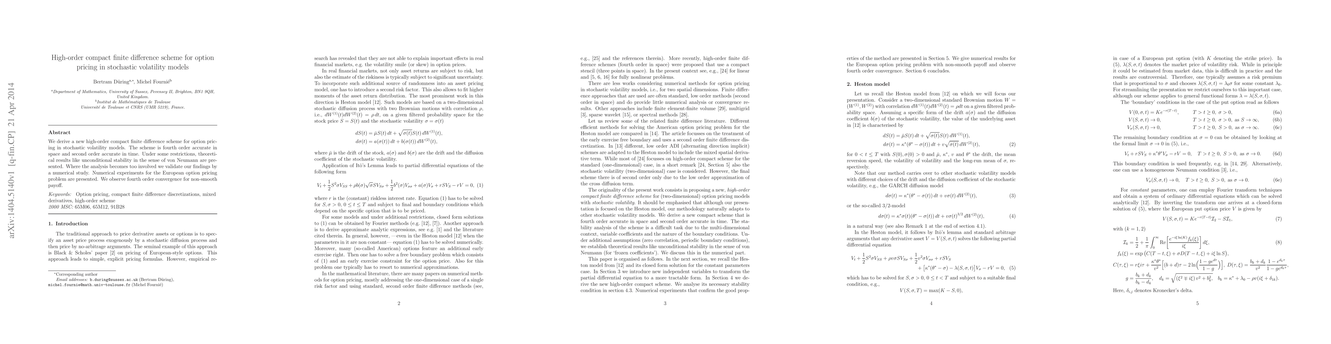 We derive a new high-order compact finite difference scheme for option pricing in stochastic volatility models. The scheme is fourth-order accurate in space and second-order accurate in time. Under some restrictions, theoretical results like unconditional stability in the sense of von Neumann are presented. Where the analysis becomes too involved we validate our findings by a numerical study. Numerical experiments for the European option pricing problem are presented. We observe fourth-order convergence for non-smooth payoff.