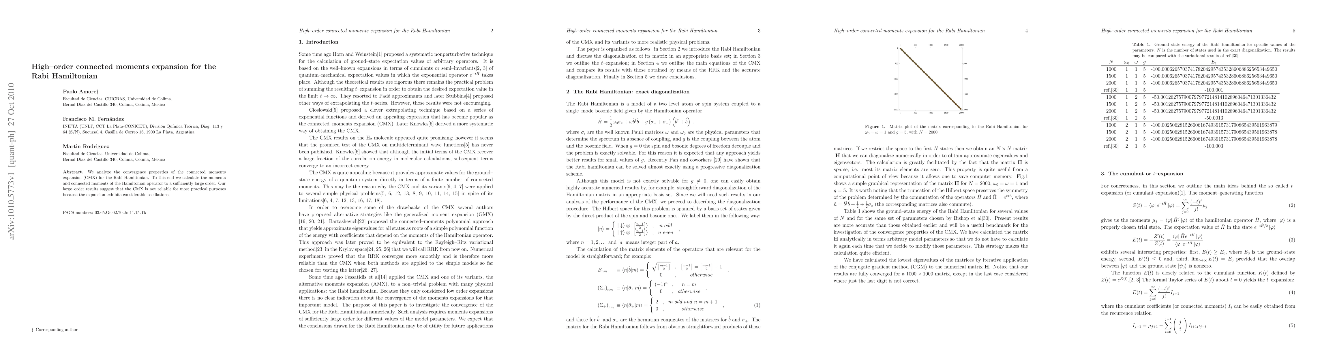 We analyze the convergence properties of the connected moments expansion (CMX) for the Rabi Hamiltonian. To this end we calculate the moments and connected moments of the Hamiltonian operator to a sufficiently large order. Our large--order results suggest that the CMX is not reliable for most practical purposes because the expansion exhibits considerable oscillations.