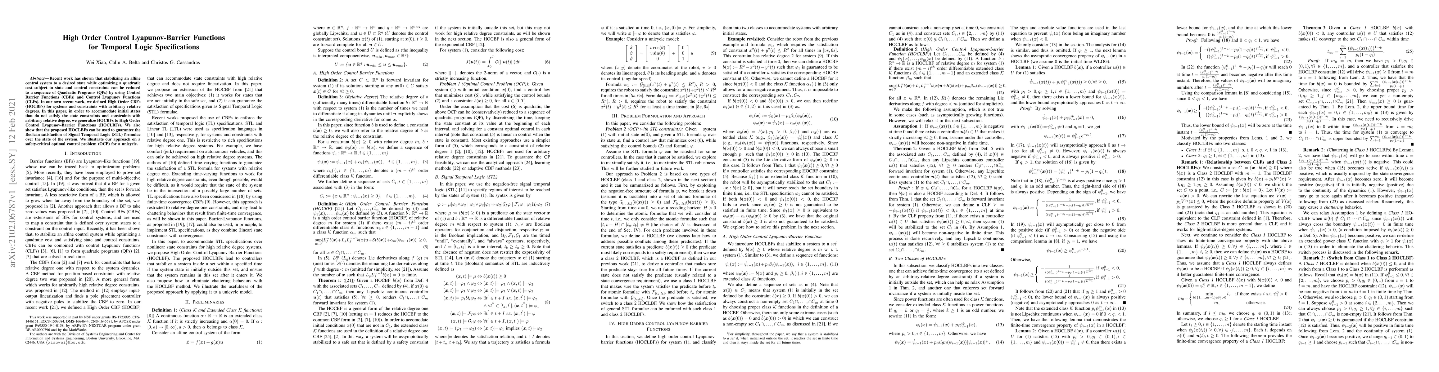 Recent work has shown that stabilizing an affine control system to a desired state while optimizing a quadratic cost subject to state and control constraints can be reduced to a sequence of Quadratic Programs (QPs) by using Control Barrier Functions (CBFs) and Control Lyapunov Functions (CLFs). In our own recent work, we defined High Order CBFs (HOCBFs) for systems and constraints with arbitrary relative degrees. In this paper, in order to accommodate initial states that do not satisfy the state constraints and constraints with arbitrary relative degree, we generalize HOCBFs to High Order Control Lyapunov-Barrier Functions (HOCLBFs). We also show that the proposed HOCLBFs can be used to guarantee the Boolean satisfaction of Signal Temporal Logic (STL) formulae over the state of the system. We illustrate our approach on a safety-critical optimal control problem (OCP) for a unicycle.