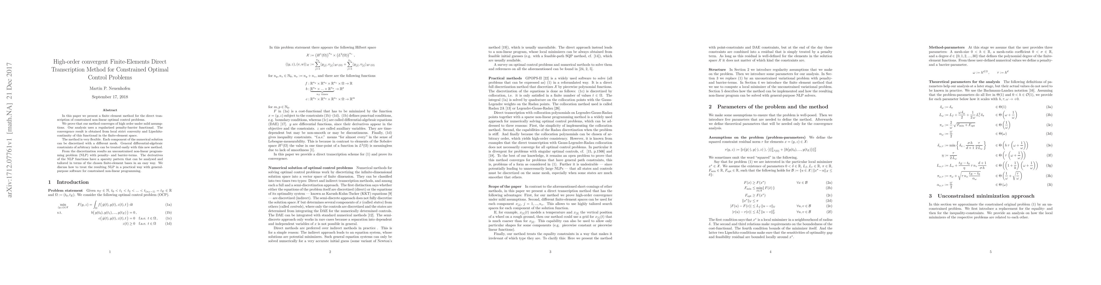 In this paper we present a finite element method for the direct transcription of constrained non-linear optimal control problems. We prove that our method converges of high order under mild assumptions. Our analysis uses a regularized penalty-barrier functional. The convergence result is obtained from local strict convexity and Lipschitz-continuity of this functional in the finite-element space. The method is very flexible. Each component of the numerical solution can be discretized with a different mesh. General differential-algebraic constraints of arbitrary index can be treated easily with this new method. From the discretization results an unconstrained non-linear programming problem (NLP) with penalty- and barrier-terms. The derivatives of the NLP functions have a sparsity pattern that can be analysed and tailored in terms of the chosen finite-element bases in an easy way. We discuss how to treat the resulting NLP in a practical way with general-purpose software for constrained non-linear programming.