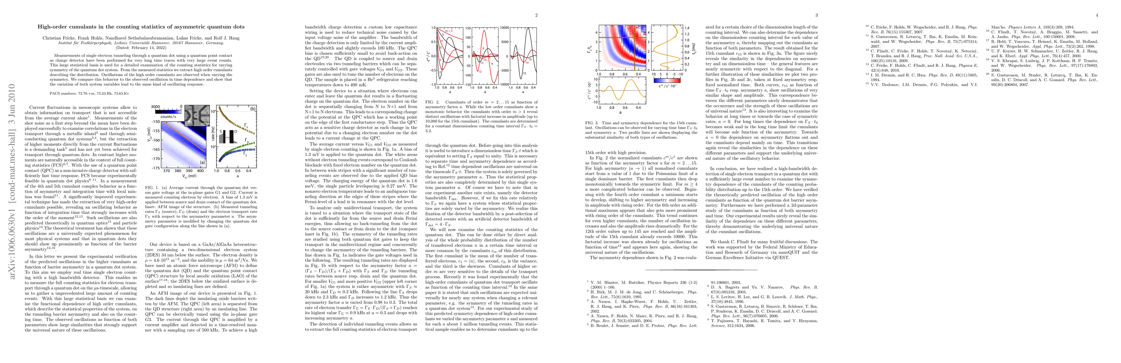 Summary: This research measures single electron tunneling through asymmetric quantum dots over long time traces, extracting high-order cumulants from the counting statistics. The study finds oscillations in the cumulants with varying symmetry, correlating these oscillations with time-dependent behavior, indicating a consistent response to symmetry changes.