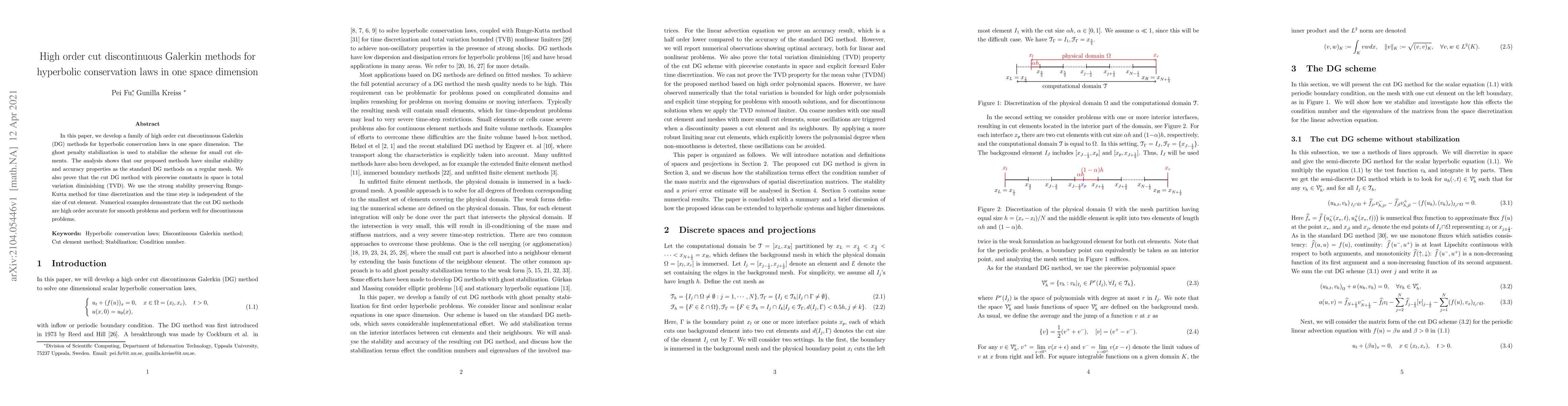 In this paper, we develop a family of high order cut discontinuous Galerkin (DG) methods for hyperbolic conservation laws in one space dimension. The ghost penalty stabilization is used to stabilize the scheme for small cut elements. The analysis shows that our proposed methods have similar stability and accuracy properties as the standard DG methods on a regular mesh. We also prove that the cut DG method with piecewise constants in space is total variation diminishing (TVD). We use the strong stability preserving Runge-Kutta method for time discretization and the time step is independent of the size of cut element. Numerical examples demonstrate that the cut DG methods are high order accurate for smooth problems and perform well for discontinuous problems.
