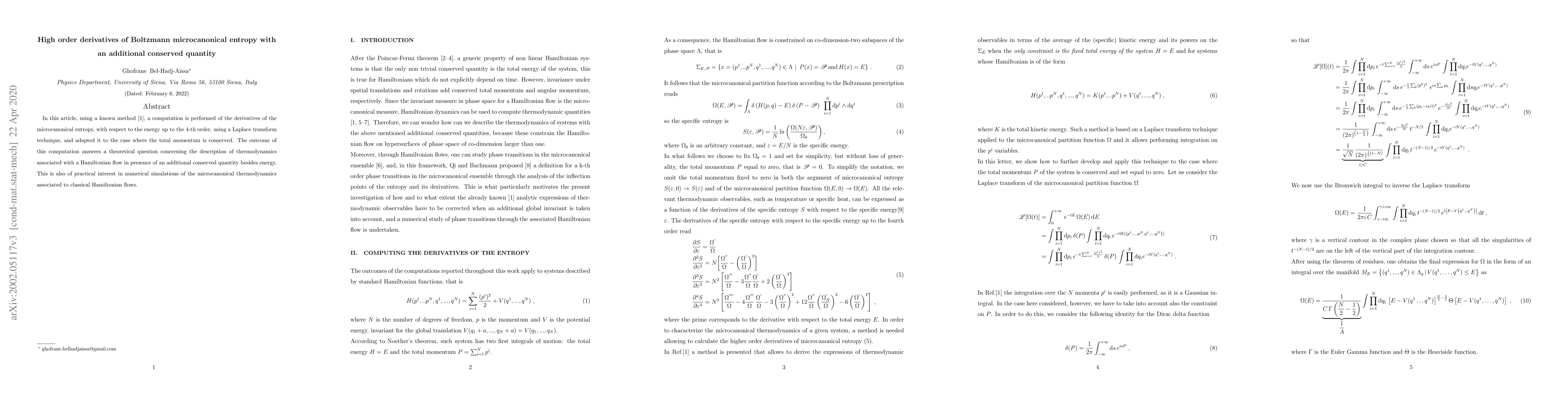 In this article, using a known method, a computation is performed of the derivatives of the microcanonical entropy, with respect to the energy up to the 4-th order, using a Laplace transform technique, and adapted it to the case where the total momentum is conserved. The outcome of this computation answers a theoretical question concerning the description of thermodynamics associated with a Hamiltonian flow in presence of an additional conserved quantity besides energy. This is also of practical interest in numerical simulations of the microcanonical thermodynamics associated to classical Hamiltonian flows.