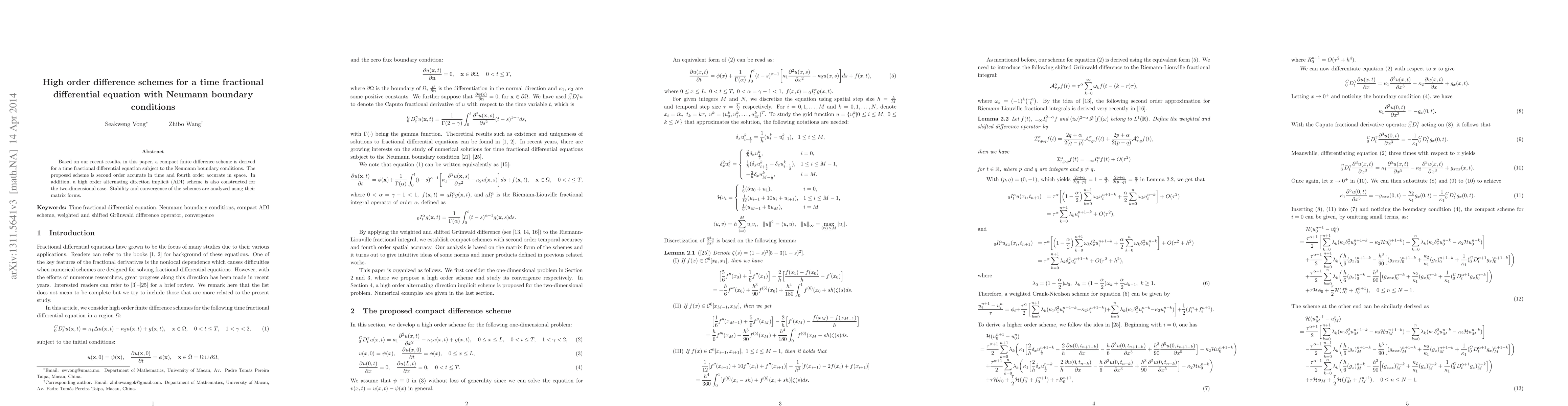 This paper develops a compact finite difference scheme for solving time fractional differential equations with Neumann boundary conditions, achieving second-order accuracy in time and fourth-order accuracy in space. Additionally, a high-order alternating direction implicit scheme is introduced for two-dimensional cases, and stability and convergence are analyzed through matrix forms.