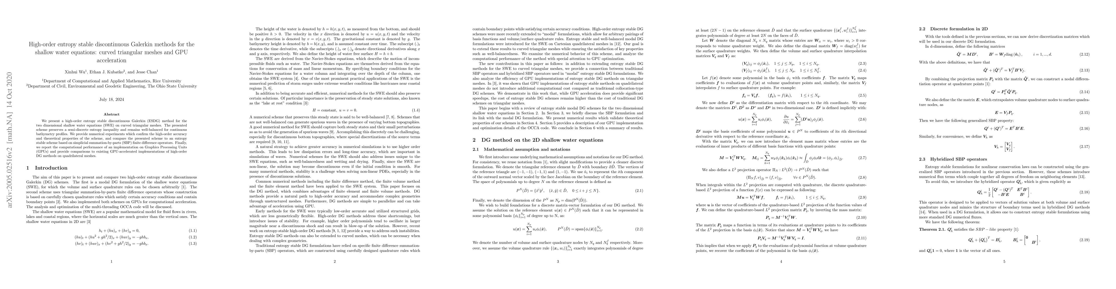This paper introduces a high-order entropy stable discontinuous Galerkin method for the 2D shallow water equations on curved triangular meshes, ensuring semi-discrete entropy preservation and computational efficiency through GPU acceleration, while comparing its performance to other high-order DG methods.