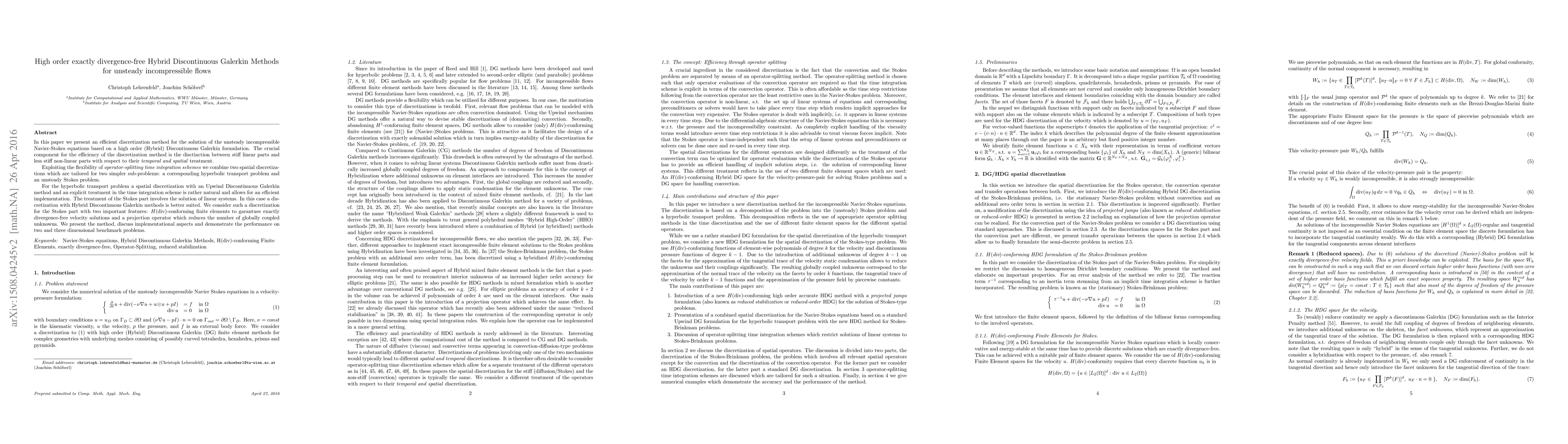 In this paper we present an efficient discretization method for the solution of the unsteady incompressible Navier-Stokes equations based on a high order (Hybrid) Discontinuous Galerkin formulation. The crucial component for the efficiency of the discretization method is the disctinction between stiff linear parts and less stiff non-linear parts with respect to their temporal and spatial treatment. Exploiting the flexibility of operator-splitting time integration schemes we combine two spatial discretizations which are tailored for two simpler sub-problems: a corresponding hyperbolic transport problem and an unsteady Stokes problem. For the hyperbolic transport problem a spatial discretization with an Upwind Discontinuous Galerkin method and an explicit treatment in the time integration scheme is rather natural and allows for an efficient implementation. The treatment of the Stokes part involves the solution of linear systems. In this case a discretization with Hybrid Discontinuous Galerkin methods is better suited. We consider such a discretization for the Stokes part with two important features: H(div)-conforming finite elements to garantuee exactly divergence-free velocity solutions and a projection operator which reduces the number of globally coupled unknowns. We present the method, discuss implementational aspects and demonstrate the performance on two and three dimensional benchmark problems.