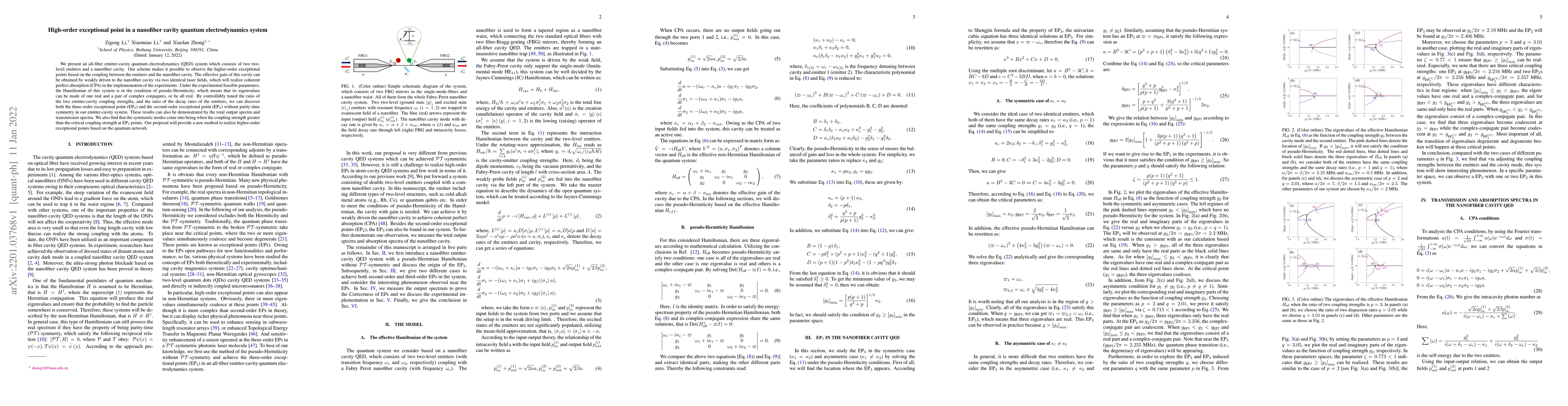 We present an all-fiber emitter-cavity quantum electrodynamics (QED) system which consists of two two-level emitters and a nanofiber cavity. Our scheme makes it possible to observe the higher-order exceptional points based on the coupling between the emitters and the nanofiber cavity. The effective gain of this cavity can be obtained by weakly driven to the nanofiber cavity via two identical laser fields, which will realize coherent perfect absorption (CPA) in the implementation of the experiments. Under the experimental feasible parameters, the Hamiltonian of this system is in the condition of pseudo-Hermiticity, which means that its eigenvalues can be made of one real and a pair of complex conjugates, or be all real. By controllably tuned the ratio of the two emitter-cavity coupling strengths, and the ratio of the decay rates of the emitters, we can discover both the three-order exceptional point (EP3) and the second-order exceptional point (EP2) without parity-time symmetry in our emitter-cavity system. These results can also be demonstrated by the total output spectra and transmission spectra. We also find that the symmetric modes come into being when the coupling strength greater than the critical coupling strength at EP3 points. Our proposal will provide a new method to realize higher-order exceptional points.