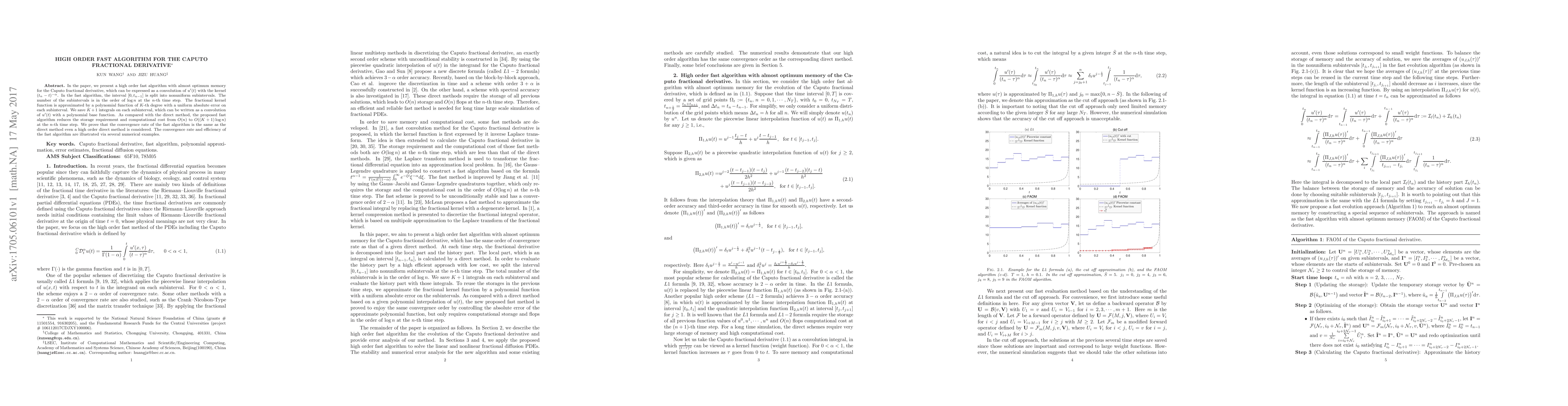 A fast algorithm for calculating the Caputo fractional derivative is presented, reducing storage and computational costs from O(n) to O((K+1)*log n), with a convergence rate comparable to high-order direct methods.