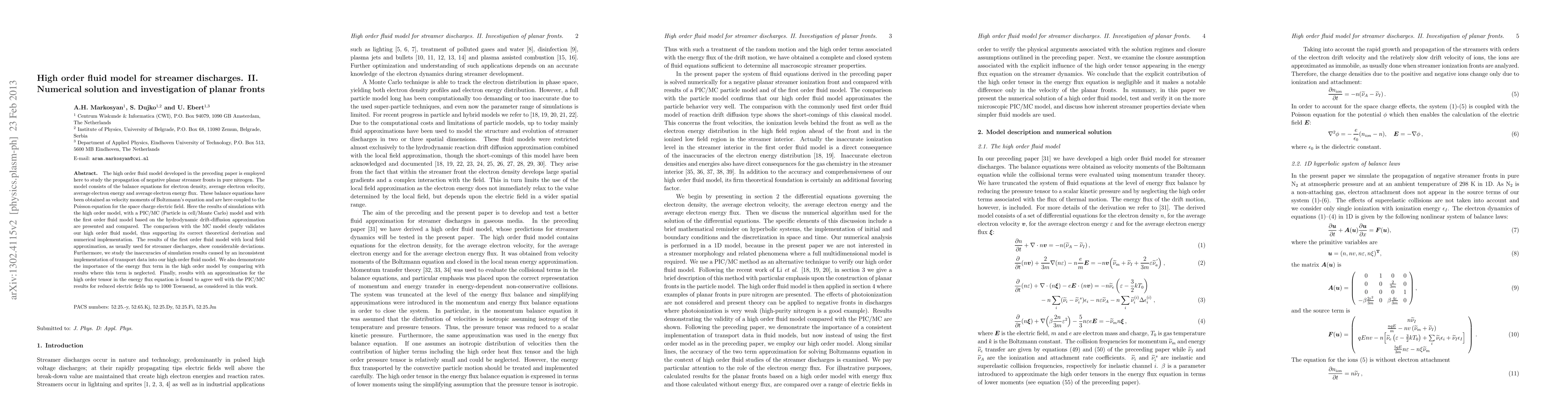 A high-order fluid model for streamer discharges was developed and validated through numerical simulations comparing it to a Particle-in-Cell/Monte Carlo model, showing accuracy in capturing negative planar front propagation.