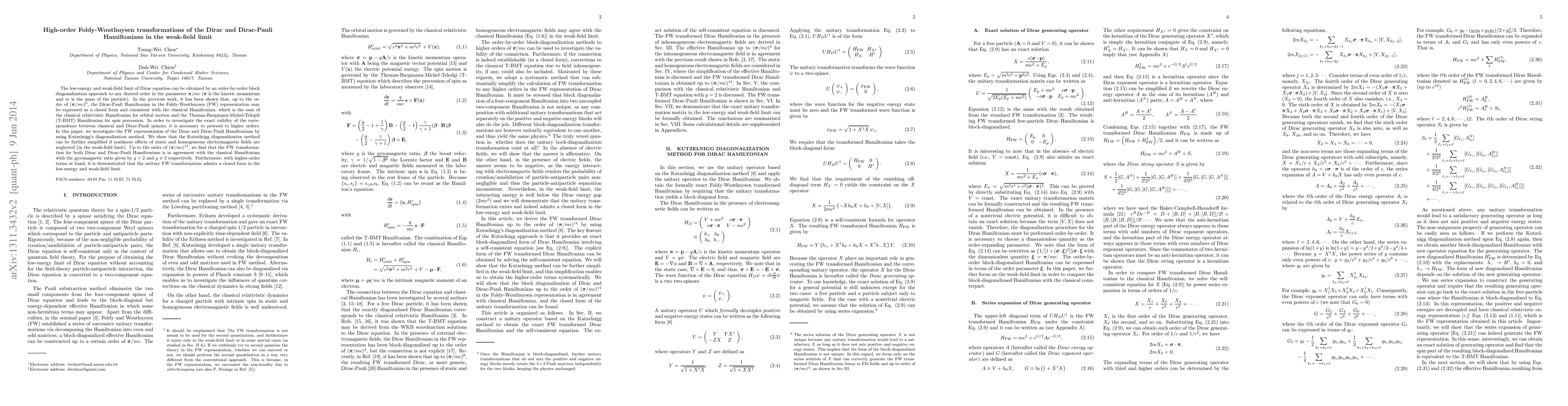 The low-energy and weak-field limit of Dirac equation can be obtained by an order-by-order block diagonalization approach to any desired order in the parameter $\pi/mc$ ($\pi$ is the kinetic momentum and $m$ is the mass of the particle). In the previous work, it has been shown that, up to the order of $(\pi/mc)^8$, the Dirac-Pauli Hamiltonian in the Foldy-Wouthuysen (FW) representation may be expressed as a closed form and consistent with the classical Hamiltonian, which is the sum of the classical relativistic Hamiltonian for orbital motion and the Thomas-Bargmann-Michel-Telegdi (T-BMT) Hamiltonian for spin precession. In order to investigate the exact validity of the correspondence between classical and Dirac-Pauli spinors, it is necessary to proceed to higher orders. In this paper, we investigate the FW representation of the Dirac and Dirac-Pauli Hamiltonians by using Kutzelnigg's diagonalization method. We show that the Kutzelnigg diagonalization method can be further simplified if nonlinear effects of static and homogeneous electromagnetic fields are neglected (in the weak-field limit). Up to the order of $(\pi/mc)^{14}$, we find that the FW transformation for both Dirac and Dirac-Pauli Hamiltonians is in agreement with the classical Hamiltonian with the gyromagnetic ratio given by $g=2$ and $g\neq2$ respectively. Furthermore, with higher-order terms at hand, it is demonstrated that the unitary FW transformation admits a closed form in the low-energy and weak-field limit.