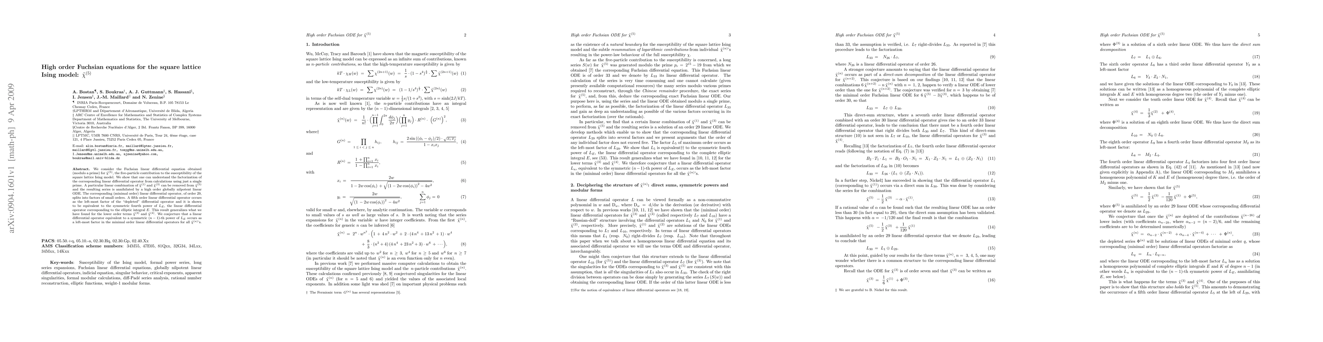 We consider the Fuchsian linear differential equation obtained (modulo a prime) for $\tilde{\chi}^{(5)}$, the five-particle contribution to the susceptibility of the square lattice Ising model. We show that one can understand the factorization of the corresponding linear differential operator from calculations using just a single prime. A particular linear combination of $\tilde{\chi}^{(1)}$ and $\tilde{\chi}^{(3)}$ can be removed from $\tilde{\chi}^{(5)}$ and the resulting series is annihilated by a high order globally nilpotent linear ODE. The corresponding (minimal order) linear differential operator, of order 29, splits into factors of small orders. A fifth order linear differential operator occurs as the left-most factor of the "depleted" differential operator and it is shown to be equivalent to the symmetric fourth power of $L_E$, the linear differential operator corresponding to the elliptic integral $E$. This result generalizes what we have found for the lower order terms $\tilde{\chi}^{(3)}$ and $\tilde{\chi}^{(4)}$. We conjecture that a linear differential operator equivalent to a symmetric $(n-1)$-th power of $L_E$ occurs as a left-most factor in the minimal order linear differential operators for all $\tilde{\chi}^{(n)}$'s.