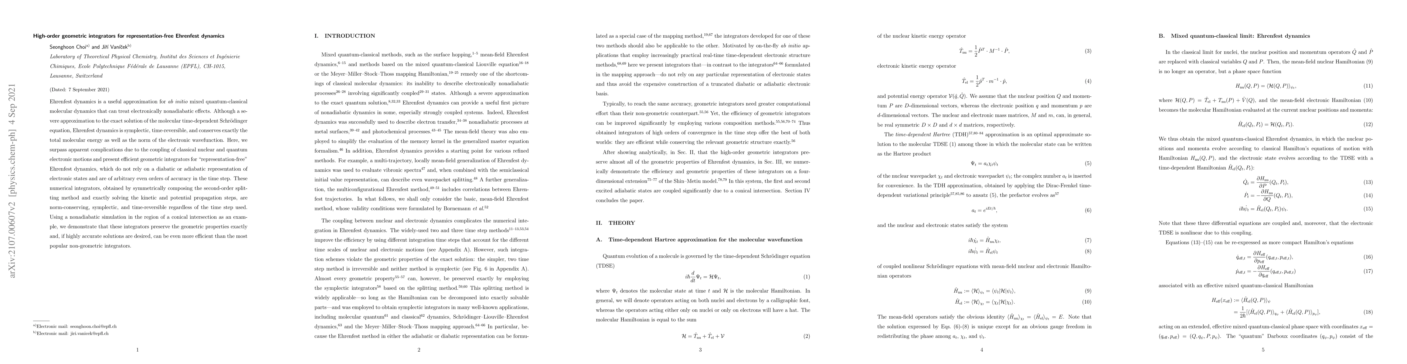 Ehrenfest dynamics is a useful approximation for ab initio mixed quantum-classical molecular dynamics that can treat electronically nonadiabatic effects. Although a severe approximation to the exact solution of the molecular time-dependent Schr\"odinger equation, Ehrenfest dynamics is symplectic, time-reversible, and conserves exactly the total molecular energy as well as the norm of the electronic wavefunction. Here, we surpass apparent complications due to the coupling of classical nuclear and quantum electronic motions and present efficient geometric integrators for "representation-free" Ehrenfest dynamics, which do not rely on a diabatic or adiabatic representation of electronic states and are of arbitrary even orders of accuracy in the time step. These numerical integrators, obtained by symmetrically composing the second-order splitting method and exactly solving the kinetic and potential propagation steps, are norm-conserving, symplectic, and time-reversible regardless of the time step used. Using a nonadiabatic simulation in the region of a conical intersection as an example, we demonstrate that these integrators preserve the geometric properties exactly and, if highly accurate solutions are desired, can be even more efficient than the most popular non-geometric integrators.