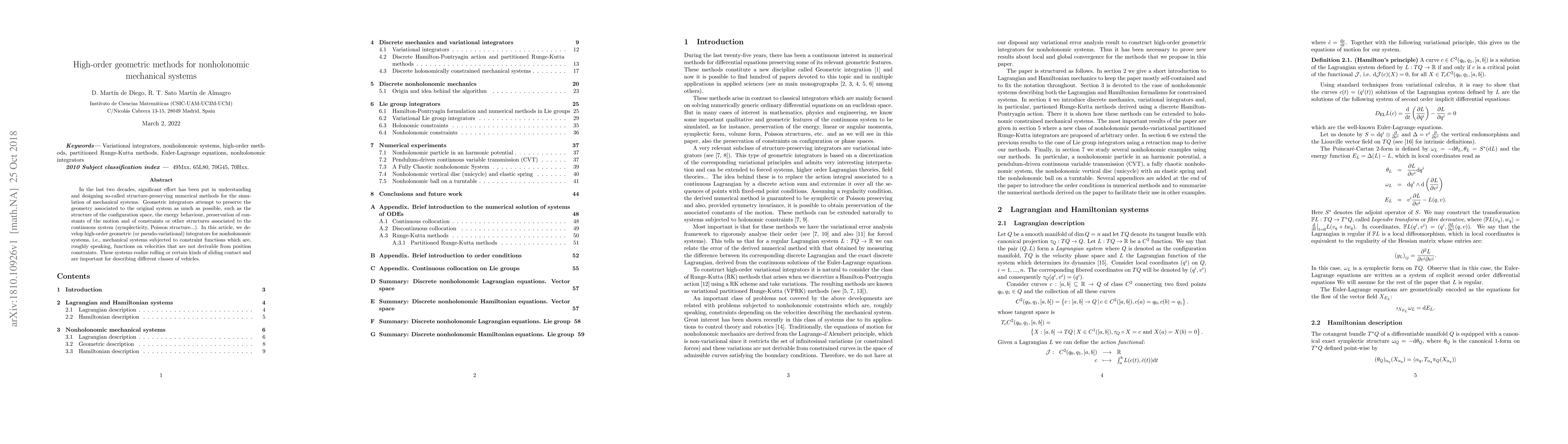 Researchers developed high-order geometric integrators for simulating nonholonomic mechanical systems that preserve their geometric structure and behavior, enabling more accurate modeling of complex vehicles and systems.