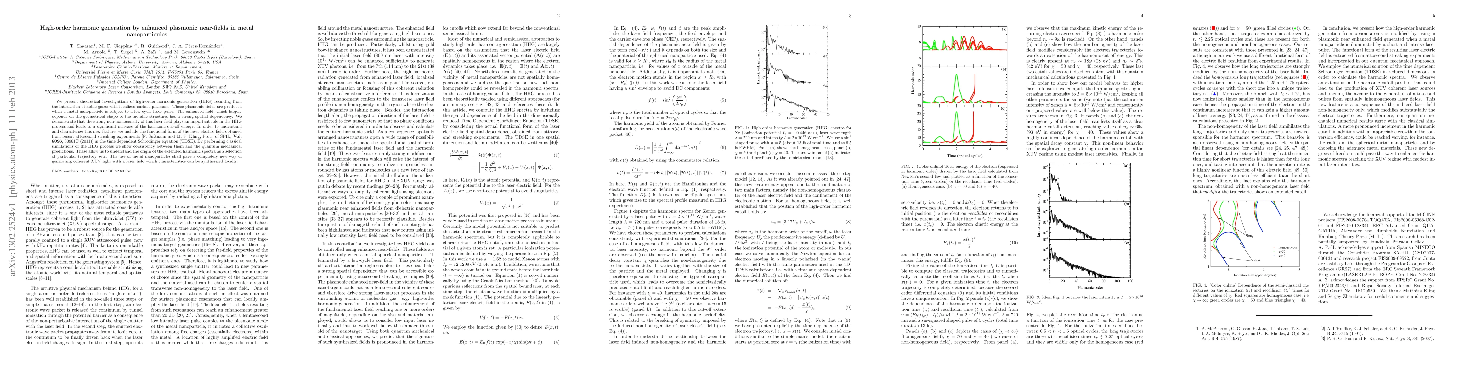 We present theoretical investigations of high-order harmonic generation (HHG) resulting from the interaction of noble gases with localized surface plasmons. These plasmonic fields are produced when a metal nanoparticle is subject to a few-cycle laser pulse. The enhanced field, which largely depends on the geometrical shape of the metallic structure, has a strong spatial dependency. We demonstrate that the strong non-homogeneity of this laser field plays an important role in the HHG process and leads to a significant increase of the harmonic cut-off energy. In order to understand and characterize this new feature, we include the functional form of the laser electric field obtained from recent attosecond streaking experiments [F. S{\"u}{\ss}mann and M. F. Kling, Proc. of SPIE, {\bf Vol. 8096}, 80961C (2011)] in the time dependent Schr\"odinger equation (TDSE). By performing classical simulations of the HHG process we show consistency between them and the quantum mechanical predictions. These allow us to understand the origin of the extended harmonic spectra as a selection of particular trajectory sets. The use of metal nanoparticles shall pave a completely new way of generating coherent XUV light with a laser field which characteristics can be synthesized locally.