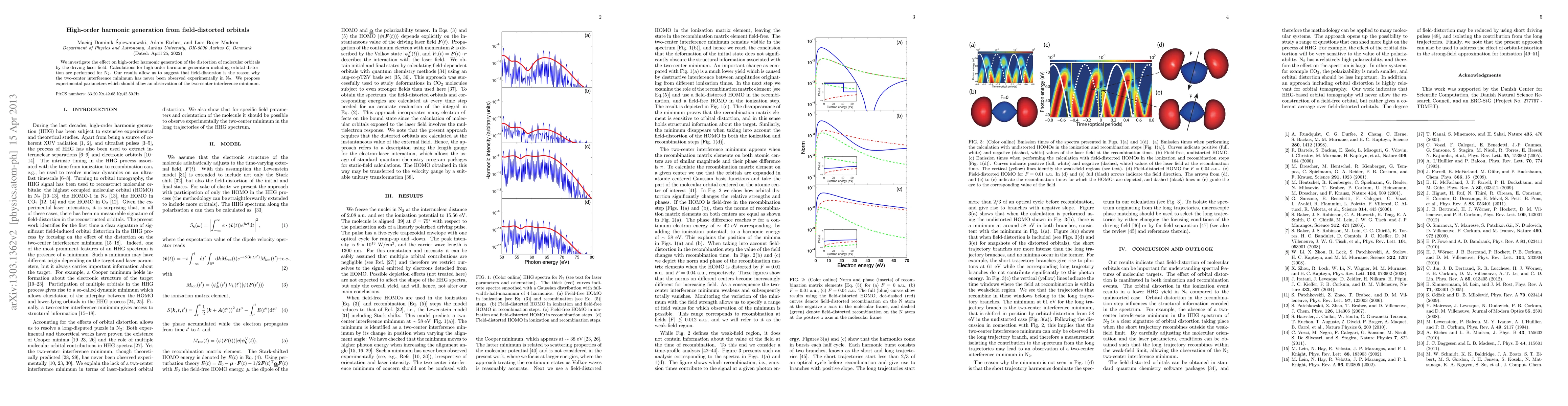 This research explores how distortions in molecular orbitals caused by a driving laser field affect high-order harmonic generation, specifically for N2. The study suggests that field-distortion explains the lack of observed two-center interference minimum in N2 experiments and proposes parameters for future experiments to potentially detect this phenomenon.