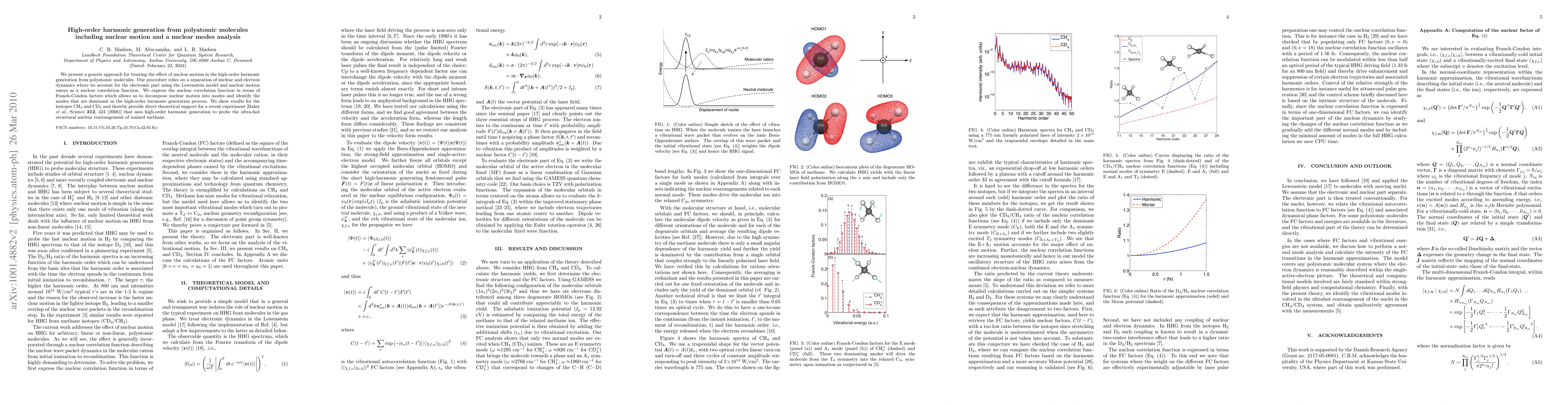 We present a generic approach for treating the effect of nuclear motion in the high-order harmonic generation from polyatomic molecules. Our procedure relies on a separation of nuclear and electron dynamics where we account for the electronic part using the Lewenstein model and nuclear motion enters as a nuclear correlation function. We express the nuclear correlation function in terms of Franck-Condon factors which allows us to decompose nuclear motion into modes and identify the modes that are dominant in the high-order harmonic generation process. We show results for the isotopes CH$_4$ and CD$_4$ and thereby provide direct theoretical support for a recent experiment [Baker {\it et al.}, Science {\bf 312}, 424 (2006)] that uses high-order harmonic generation to probe the ultra-fast structural nuclear rearrangement of ionized methane.