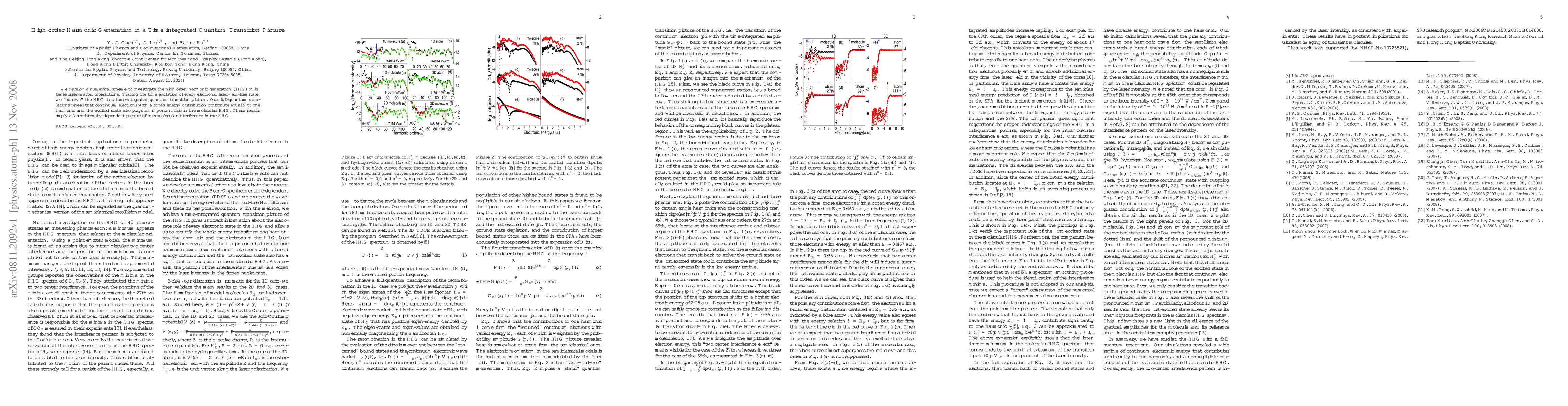 We develop a numerical scheme to investigate the high-order harmonic generation (HHG) in intense laser-matter interactions. Tracing the time evolution of every electronic laser-field-free state, we "observe" the HHG in a time-integrated quantum transition picture. Our full-quantum simulations reveal that continuum electrons with a broad energy distribution contribute equally to one harmonic and the excited state also plays an important role in the molecular HHG. These results imply a laser-intensity-dependent picture of intramolecular interference in the HHG.