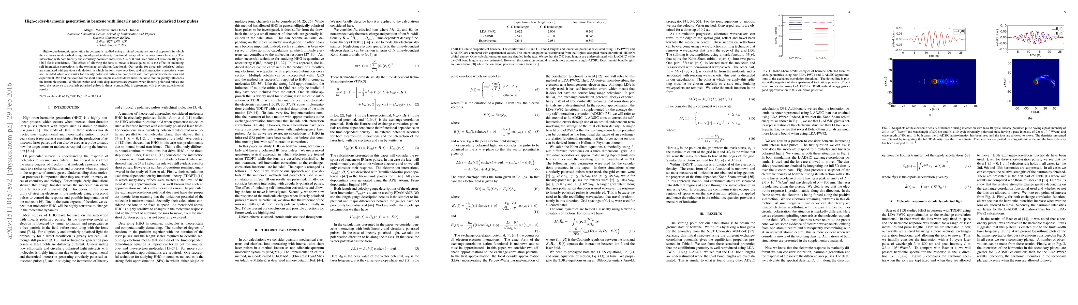 High harmonic generation in benzene is studied using a mixed quantum-classical approach in which the electrons are described using time-dependent density functional theory while the ions move classically. The interaction with both circularly and linearly polarised infra-red ($\lambda = 800$ nm) laser pulses of duration 10 cycles (26.7 fs) is considered. The effect of allowing the ions to move is investigated as is the effect of including self-interaction corrections to the exchange-correlation functional. Our results for circularly polarised pulses are compared with previous calculations in which the ions were kept fixed and self-interaction corrections were not included while our results for linearly polarised pulses are compared with both previous calculations and experiment. We find that even for the short duration pulses considered here, the ionic motion greatly influences the harmonic spectra. While ionization and ionic displacements are greatest when linearly polarised pulses are used, the response to circularly polarised pulses is almost comparable, in agreement with previous experimental results.