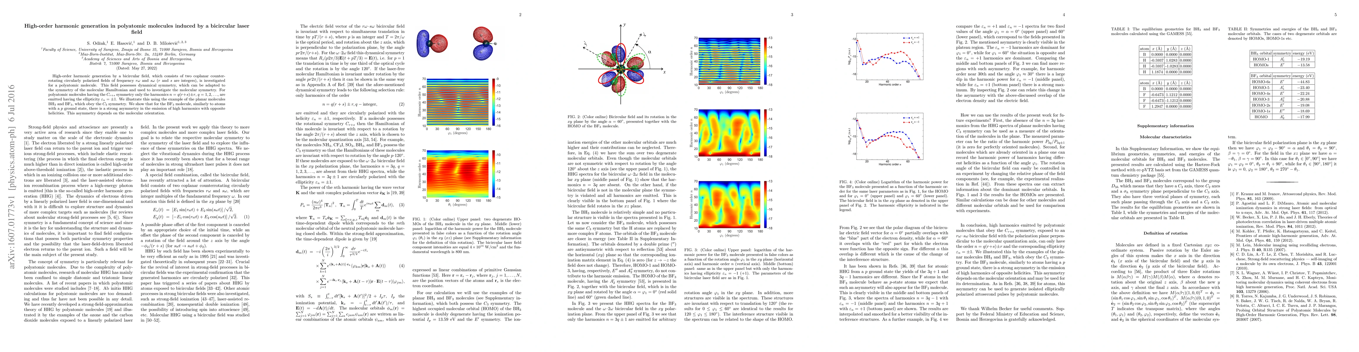 This research investigates high-order harmonic generation in polyatomic molecules using a bicircular laser field, revealing that only harmonics with specific orders are emitted based on the molecule's symmetry. For $C_{r+s}$ symmetric molecules like BF$_3$, harmonic emission asymmetry with opposite helicities varies depending on the molecular orientation.