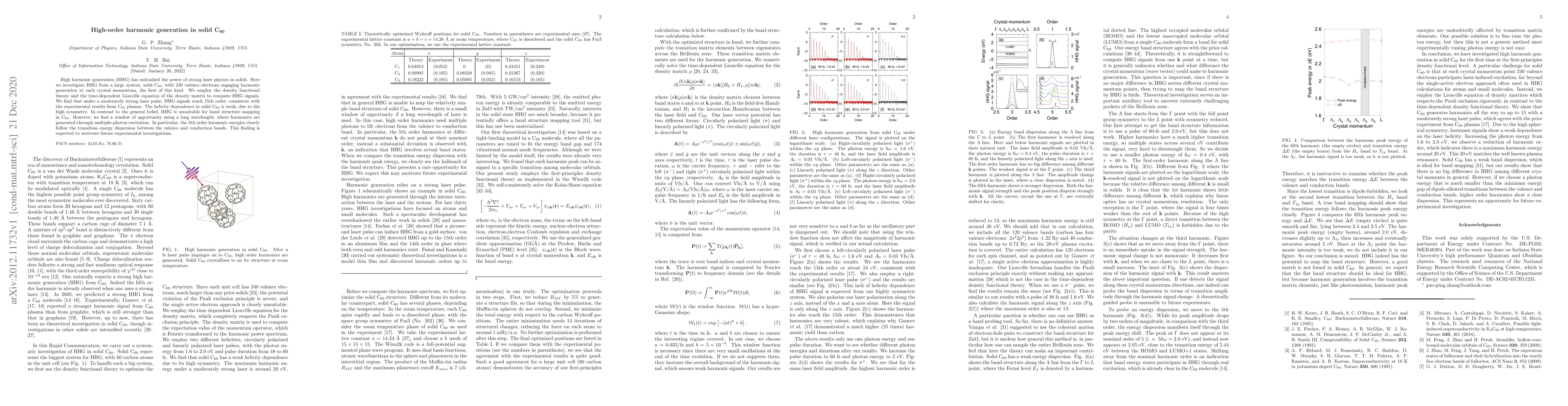 This paper investigates high harmonic generation (HHG) in solid C$_{60}$ using density functional theory and the time-dependent Liouville equation. It finds HHG signals reaching the 15th order under strong laser pulses, and suggests a potential method for probing band structure via multiple-photon excitation at long wavelengths.