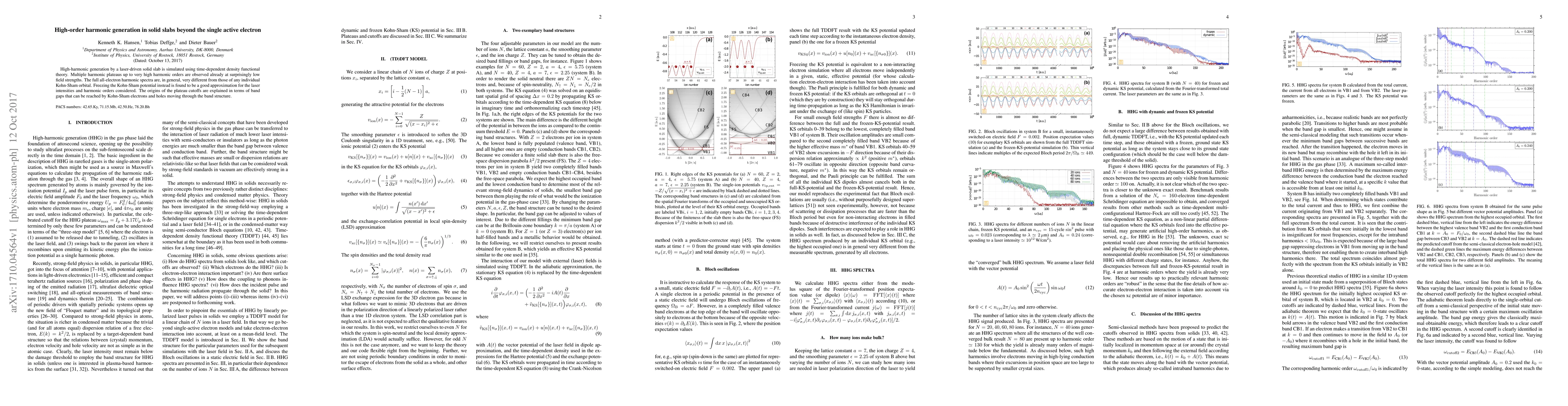 This study simulates high-order harmonic generation in solid slabs using time-dependent density functional theory, revealing multiple harmonic plateaus at low field strengths. The all-electron spectra differ significantly from individual Kohn-Sham orbitals, but freezing the Kohn-Sham potential provides a good approximation for the observed harmonics, with plateau cutoffs explained by band gaps.