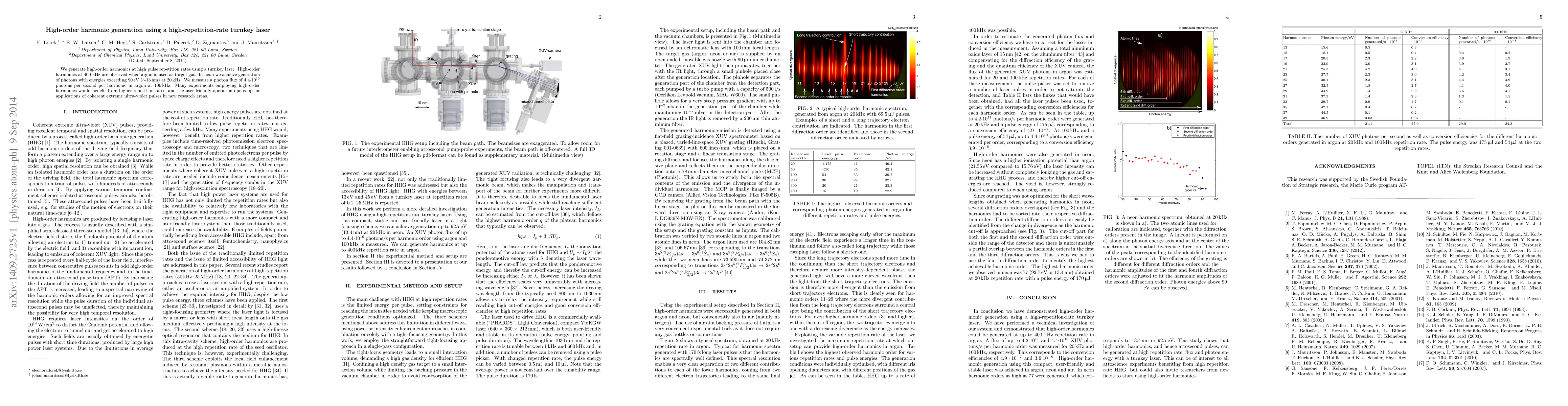 This paper reports the generation of high-order harmonics at high pulse repetition rates using a turnkey laser, achieving 400 kHz in argon and 20 kHz in neon, with photon energies exceeding 90 eV. The study highlights the potential for new research applications enabled by the high photon flux and user-friendly operation of the laser system.