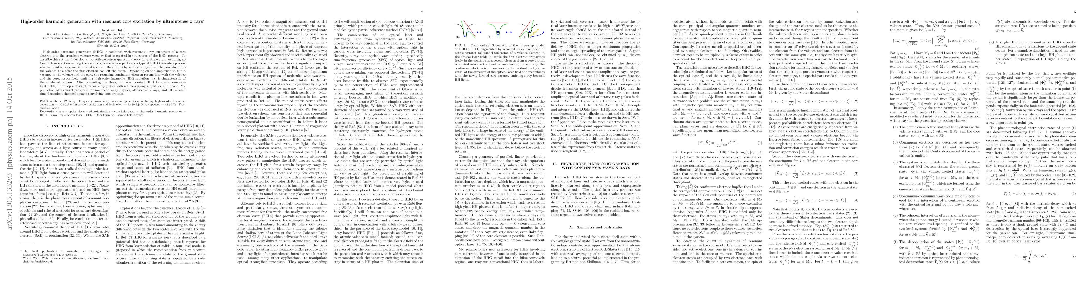 High-order harmonic generation (HHG) is combined with resonant x-ray excitation of a core electron into the transient valence vacancy that is created in the course of the HHG process. To describe this setting, I develop a two-active-electron quantum theory for a single atom assuming no Coulomb interaction among the electrons; one electron performs a typical HHG three-step process whereas another electron is excited (or even Rabi flops) by intense x rays from the core shell into the valence hole after the first electron has left the atom. Depending on the amplitude to find a vacancy in the valence and the core, the returning continuum electron recombines with the valence and the core, respectively, emitting high-order harmonic (HH) radiation that is characteristic of the combined process. After presenting the theory of x-ray boosted HHG for continuous-wave light fields, I develop a description for x-ray pulses with a time-varying amplitude and phase. My prediction offers novel prospects for nonlinear x-ray physics, attosecond x rays, and HHG-based time-dependent chemical imaging involving core orbitals.