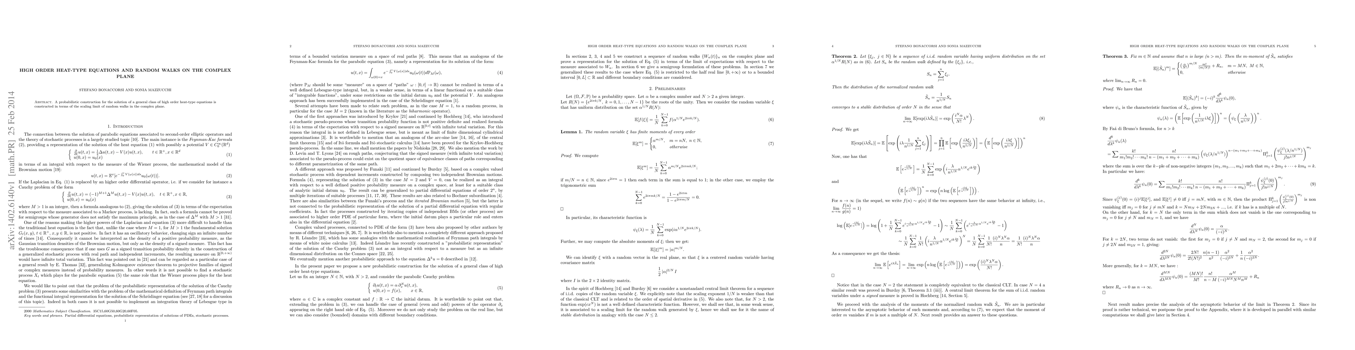 This paper develops a probabilistic method to solve high-order heat-type equations using the scaling limit of random walks in the complex plane.
