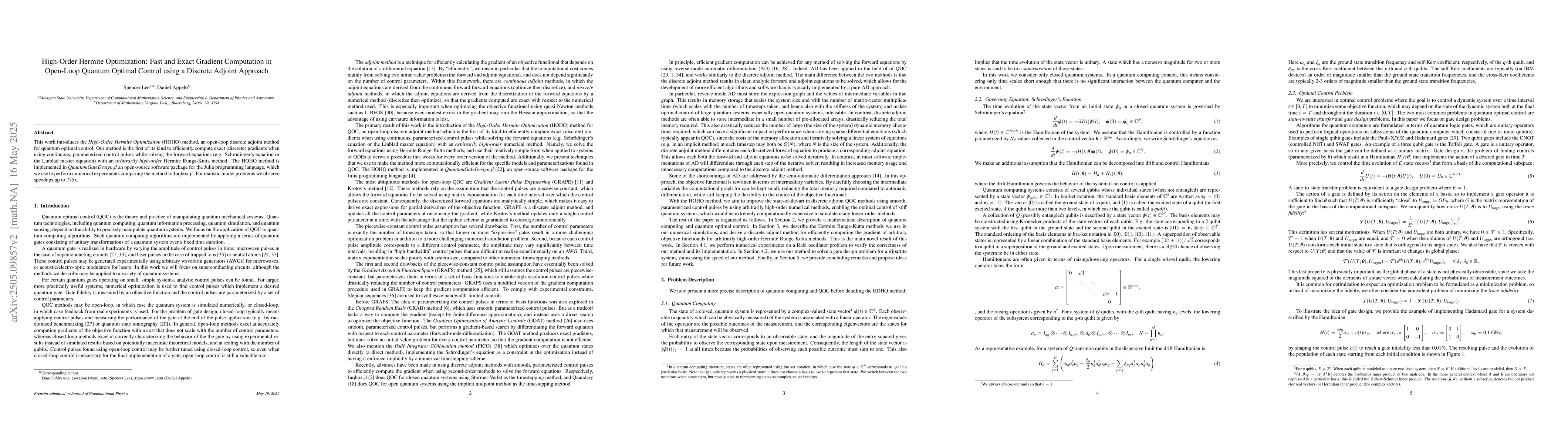 The research introduces High-Order Hermite Optimization (HOHO), an open-loop discrete adjoint method for quantum optimal control, which efficiently computes exact gradients using continuous, parameterized control pulses and high-order Hermite Runge-Kutta methods to solve forward equations like Schrodinger's or Linblad master equations. The method is implemented in QuantumGateDesign.jl, a Julia-based open-source software package.
