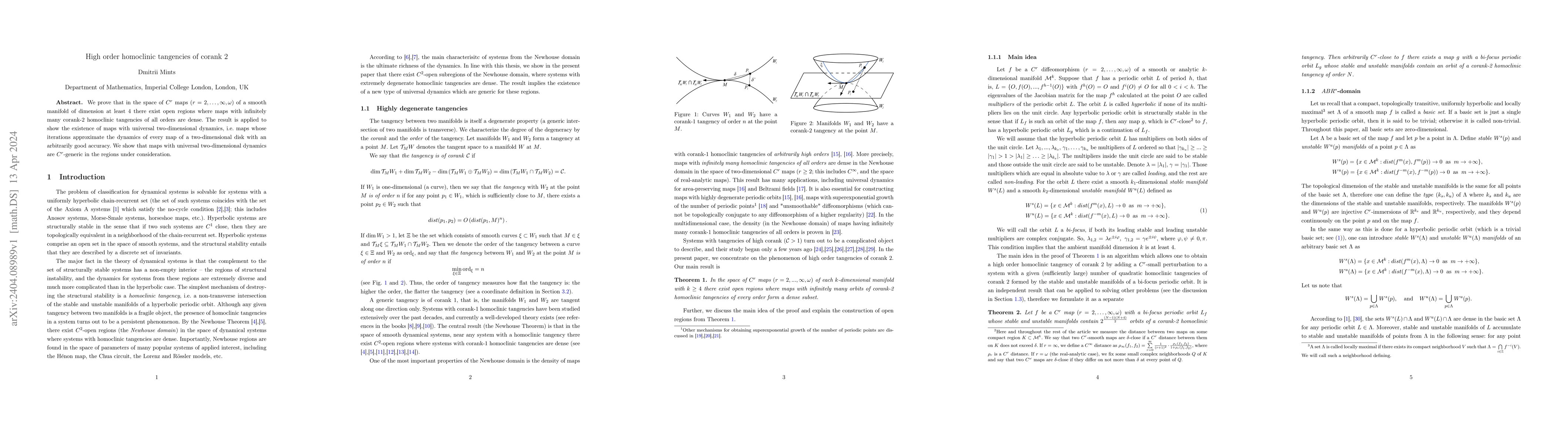 We prove that in the space of $C^r$ maps $(r=2,\ldots,\infty,\omega)$ of a smooth manifold of dimension at least 4 there exist open regions where maps with infinitely many corank-2 homoclinic tangencies of all orders are dense. The result is applied to show the existence of maps with universal two-dimensional dynamics, i.e. maps whose iterations approximate the dynamics of every map of a two-dimensional disk with an arbitrarily good accuracy. We show that maps with universal two-dimensional dynamics are $C^r$-generic in the regions under consideration.
