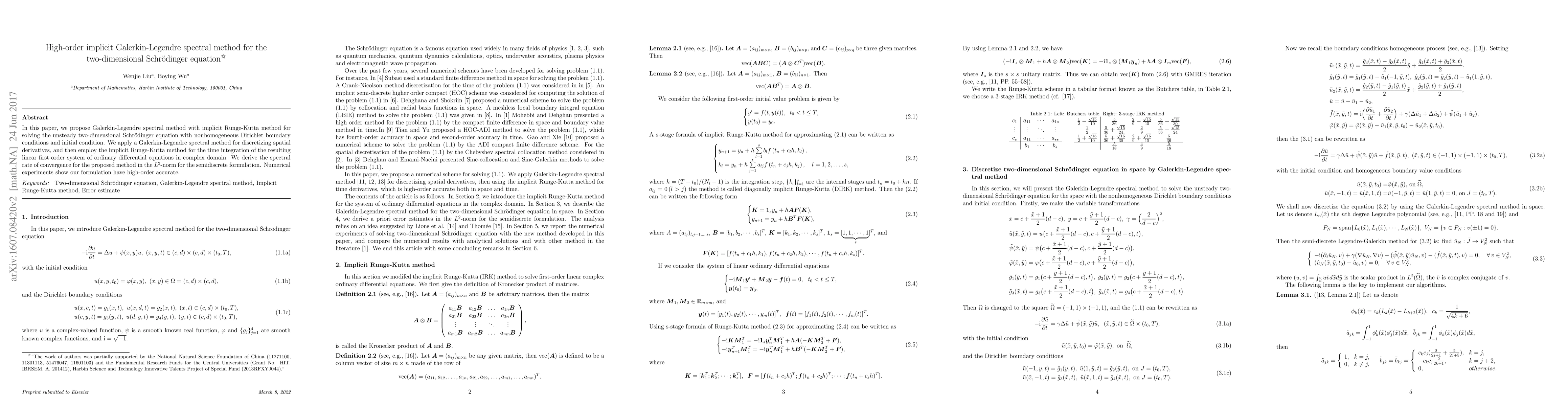 This paper proposes a high-order implicit Galerkin-Legendre spectral method combined with an implicit Runge-Kutta method for solving the unsteady two-dimensional Schrödinger equation. The method demonstrates high-order accuracy and exponential convergence rates in numerical experiments.