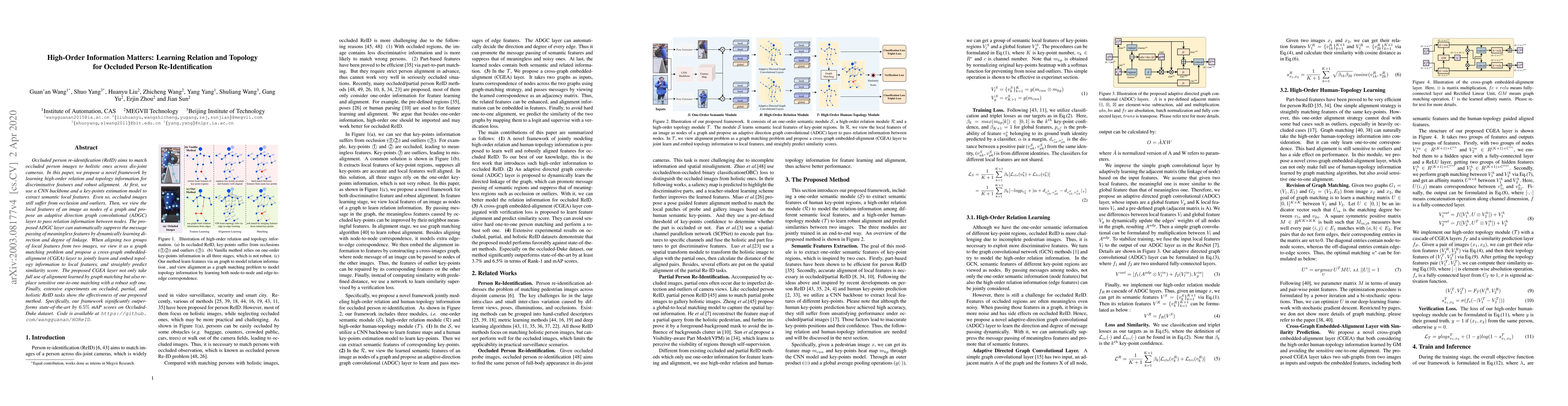 Occluded person re-identification (ReID) aims to match occluded person images to holistic ones across dis-joint cameras. In this paper, we propose a novel framework by learning high-order relation and topology information for discriminative features and robust alignment. At first, we use a CNN backbone and a key-points estimation model to extract semantic local features. Even so, occluded images still suffer from occlusion and outliers. Then, we view the local features of an image as nodes of a graph and propose an adaptive direction graph convolutional (ADGC)layer to pass relation information between nodes. The proposed ADGC layer can automatically suppress the message-passing of meaningless features by dynamically learning di-rection and degree of linkage. When aligning two groups of local features from two images, we view it as a graph matching problem and propose a cross-graph embedded-alignment (CGEA) layer to jointly learn and embed topology information to local features, and straightly predict similarity score. The proposed CGEA layer not only take full use of alignment learned by graph matching but also re-place sensitive one-to-one matching with a robust soft one. Finally, extensive experiments on occluded, partial, and holistic ReID tasks show the effectiveness of our proposed method. Specifically, our framework significantly outperforms state-of-the-art by6.5%mAP scores on Occluded-Duke dataset.