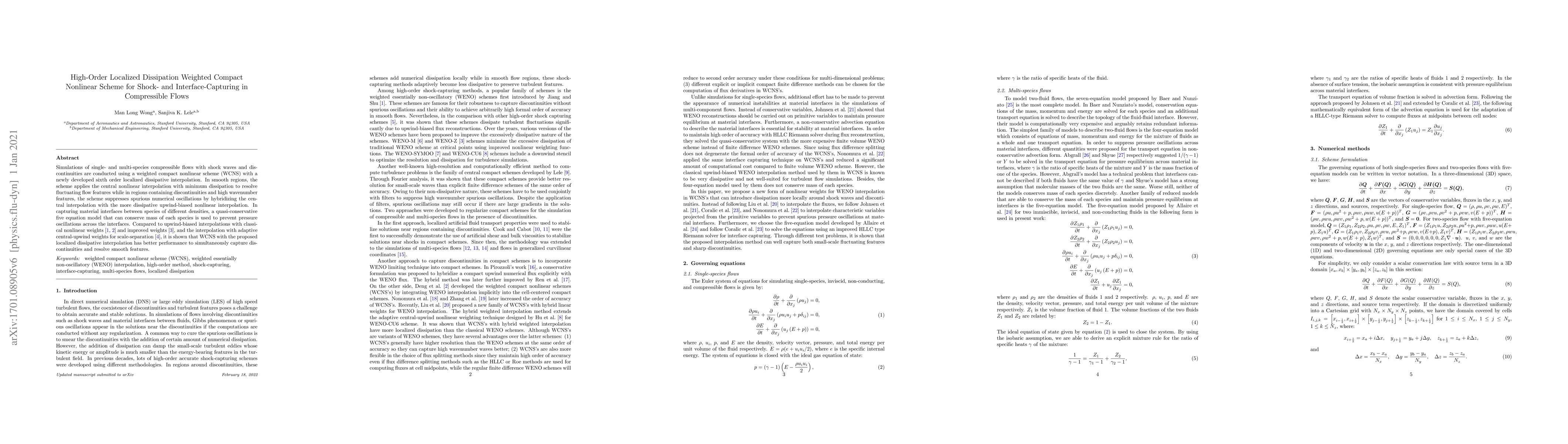 Simulations of single- and multi-species compressible flows with shock waves and discontinuities are conducted using a weighted compact nonlinear scheme (WCNS) with a newly developed sixth order localized dissipative interpolation. In smooth regions, the scheme applies the central nonlinear interpolation with minimum dissipation to well resolve fluctuating flow features while in regions containing discontinuities and high wavenumber features, the scheme suppresses spurious numerical oscillations by hybridizing the central interpolation with the more dissipative upwind-biased nonlinear interpolation. In capturing material interfaces between species of different densities, a quasi-conservative five equation model that can conserve mass of each species is used to prevent pressure oscillations across the interfaces. Compared to upwind-biased interpolations with classical nonlinear weights and improved weights, and the interpolation with adaptive central-upwind weights for scale-separation, it is shown that WCNS with the proposed localized dissipative interpolation has better performance to simultaneously capture discontinuities and resolve smooth features.