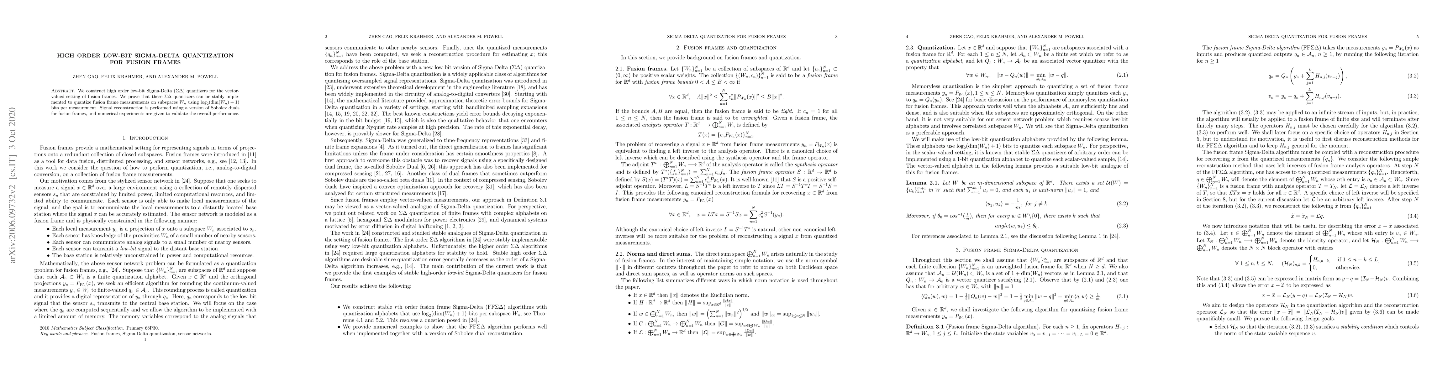This paper develops high-order low-bit Sigma-Delta quantizers for fusion frames, proving their stable implementation using $\log_2( {\rm dim}(W_n)+1)$ bits per measurement, and validates performance through numerical experiments. Signal reconstruction leverages Sobolev duals for fusion frames.
