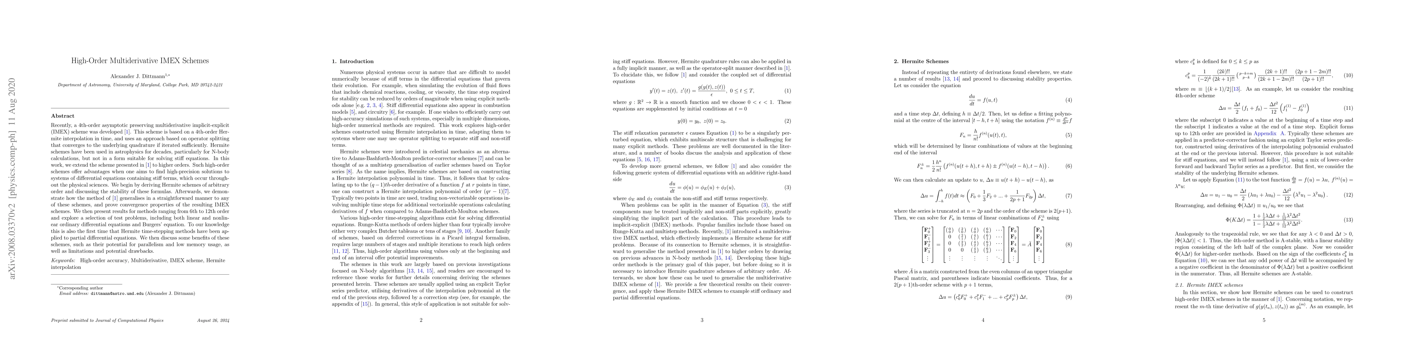 Recently, a 4th-order asymptotic preserving multiderivative implicit-explicit (IMEX) scheme was developed (Sch\"utz and Seal 2020, arXiv:2001.08268). This scheme is based on a 4th-order Hermite interpolation in time, and uses an approach based on operator splitting that converges to the underlying quadrature if iterated sufficiently. Hermite schemes have been used in astrophysics for decades, particularly for N-body calculations, but not in a form suitable for solving stiff equations. In this work, we extend the scheme presented in Sch\"utz and Seal 2020 to higher orders. Such high-order schemes offer advantages when one aims to find high-precision solutions to systems of differential equations containing stiff terms, which occur throughout the physical sciences. We begin by deriving Hermite schemes of arbitrary order and discussing the stability of these formulas. Afterwards, we demonstrate how the method of Sch\"utz and Seal 2020 generalises in a straightforward manner to any of these schemes, and prove convergence properties of the resulting IMEX schemes. We then present results for methods ranging from 6th to 12th order and explore a selection of test problems, including both linear and nonlinear ordinary differential equations and Burgers' equation. To our knowledge this is also the first time that Hermite time-stepping methods have been applied to partial differential equations. We then discuss some benefits of these schemes, such as their potential for parallelism and low memory usage, as well as limitations and potential drawbacks.