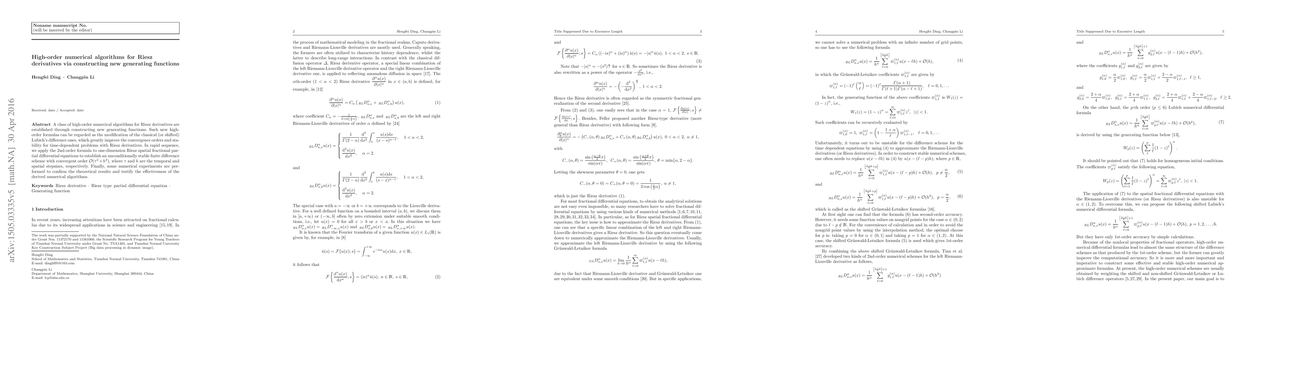 A class of high-order numerical algorithms for Riesz derivatives are established through constructing new generating functions. Such new high-order formulas can be regarded as the modification of the classical (or shifted) Lubich's difference ones, which greatly improve the convergence orders and stability for time-dependent problems with Riesz derivatives. In rapid sequence, we apply the 2nd-order formula to one-dimension Riesz spatial fractional partial differential equations to establish an unconditionally stable finite difference scheme with convergent order $O(\tau^2+h^2)$, where $\tau$ and $h$ are the temporal and spatial stepsizes, respectively. Finally, some numerical experiments are performed to confirm the theoretical results and testify the effectiveness of the derived numerical algorithms.