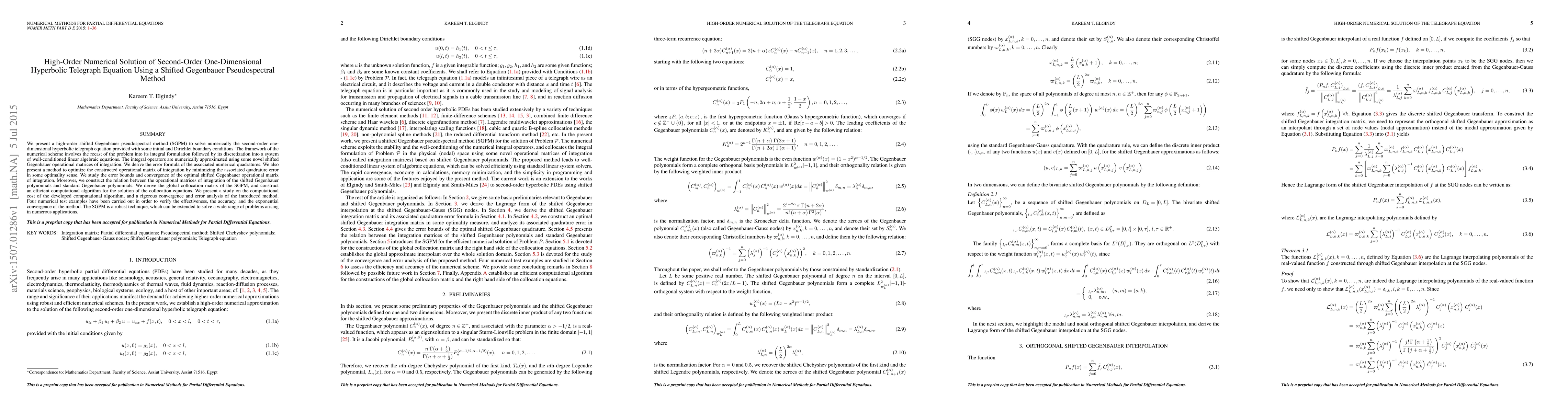 This paper introduces a high-order shifted Gegenbauer pseudospectral method (SGPM) to numerically solve the second-order one-dimensional hyperbolic telegraph equation. The method involves recasting the problem into an integral formulation, discretizing it into a system of linear algebraic equations, and optimizing the operational matrix of integration to minimize quadrature error.