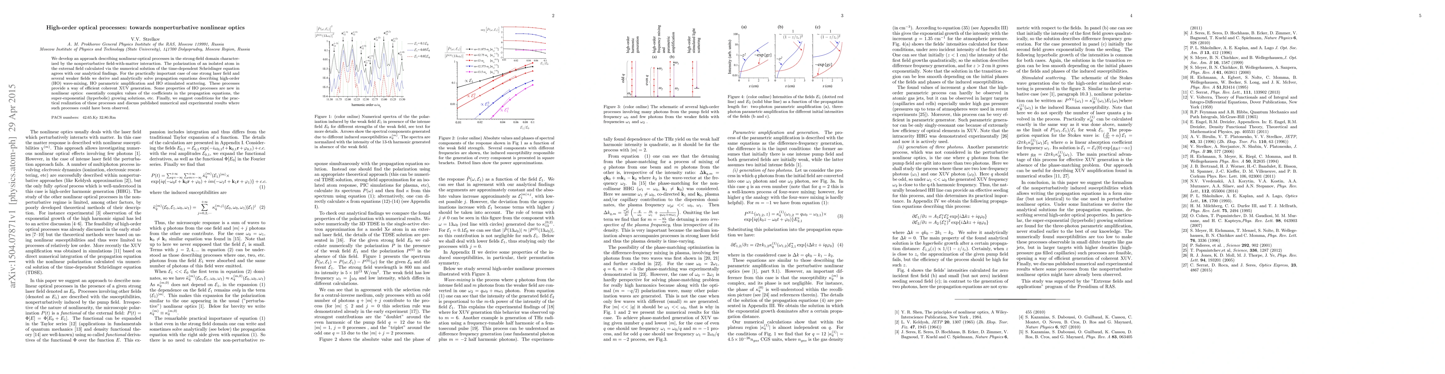 We develop an approach describing nonlinear-optical processes in the strong-field domain characterized by the nonperturbative field-with-matter interaction. The polarization of an isolated atom in the external field calculated via the numerical solution of the time-dependent Schr\"odinger equation agrees with our analytical findings. For the practically important case of one strong laser field and several weaker fields we derive and analytically solve propagation equations describing high-order (HO) wave-mixing, HO parametric amplification and HO stimulated scattering. These processes provide a way of efficient coherent XUV generation. Some properties of HO processes are new in nonlinear optics: essentially complex values of the coefficients in the propagation equations, the super-exponential (hyperbolic) growing solutions, etc. Finally, we suggest conditions for the practical realization of these processes and discuss published numerical and experimental results where such processes could have been observed.