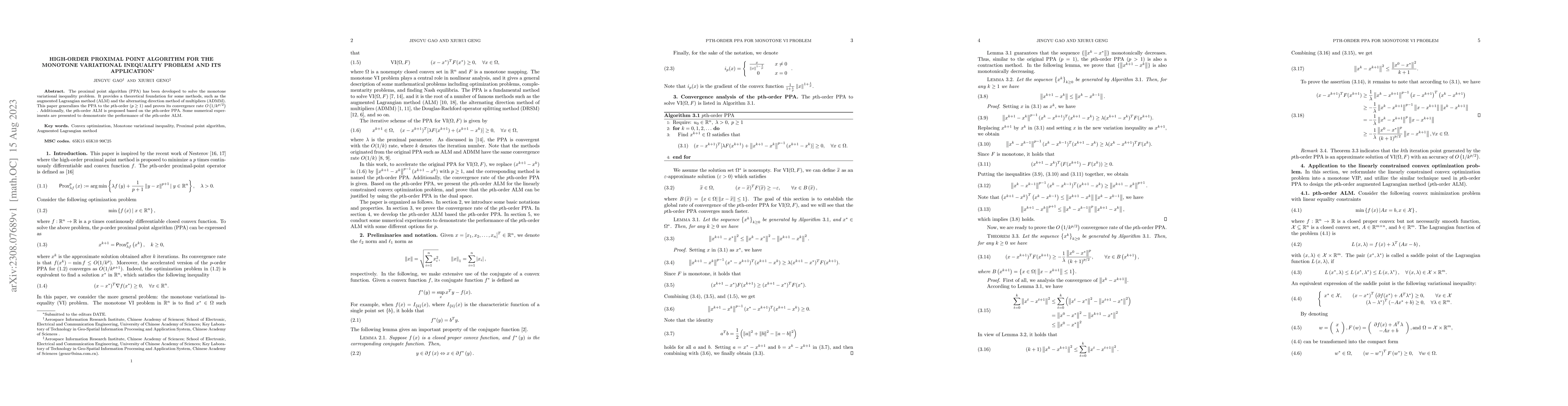 The proximal point algorithm (PPA) has been developed to solve the monotone variational inequality problem. It provides a theoretical foundation for some methods, such as the augmented Lagrangian method (ALM) and the alternating direction method of multipliers (ADMM). This paper generalizes the PPA to the $p$th-order ($p\geq 1$) and proves its convergence rate $O \left(1/k^{p/2}\right)$ . Additionally, the $p$th-order ALM is proposed based on the $p$th-order PPA. Some numerical experiments are presented to demonstrate the performance of the $p$th-order ALM.