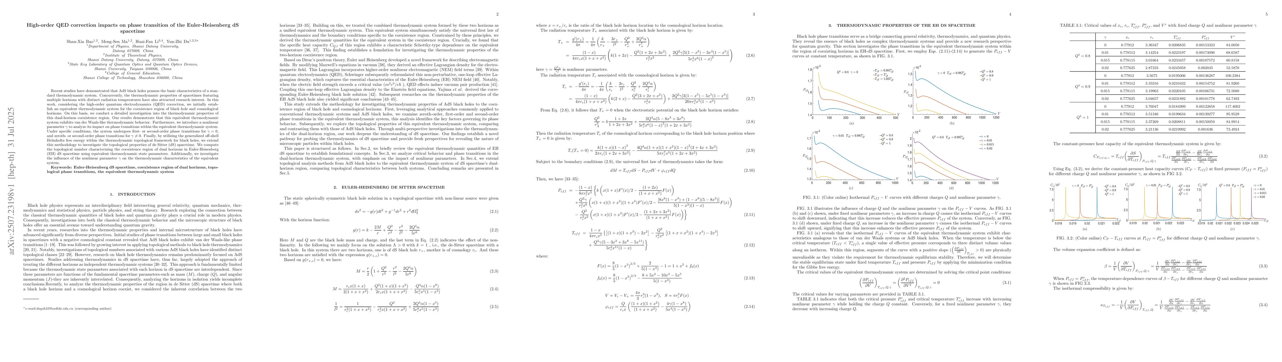 Recent studies have demonstrated that AdS black holes possess the basic characteristics of a standard thermodynamic system. Concurrently, the thermodynamic properties of spacetimes featuring multiple horizons with distinct radiation temperatures have also attracted research interest. In this work, considering the high-order quantum electrodynamics (QED) correction, we initially establish an equivalent thermodynamic system for the coexistence region of black hole and cosmological horizons. On this basis, we conduct a detailed investigation into the thermodynamic properties of this dual-horizon coexistence region. Our results demonstrate that this equivalent thermodynamic system exhibits van der Waals-like thermodynamic behavior. Furthermore, we introduce a nonlinear parameter $\gamma$ to analyze its impact on phase transitions within the equivalent thermodynamic system. Under specific conditions, the system undergoes first- or second-order phase transitions for $\gamma=0$, and zeroth- or second-order phase transitions for $\gamma\neq0$. Finally, by utilizing the generalized off-shell Helmholtz free energy within the thermodynamic topological framework for black holes, we extend this methodology to investigate the topological properties of de Sitter (dS) spacetime. We compute the topological number characterizing the coexistence region of dual horizons in Euler-Heisenberg (EH) dS spacetime using equivalent thermodynamic state parameters. Additionally, we investigate the influence of the nonlinear parameter $\gamma$ on the thermodynamic characteristics of the equivalent system.