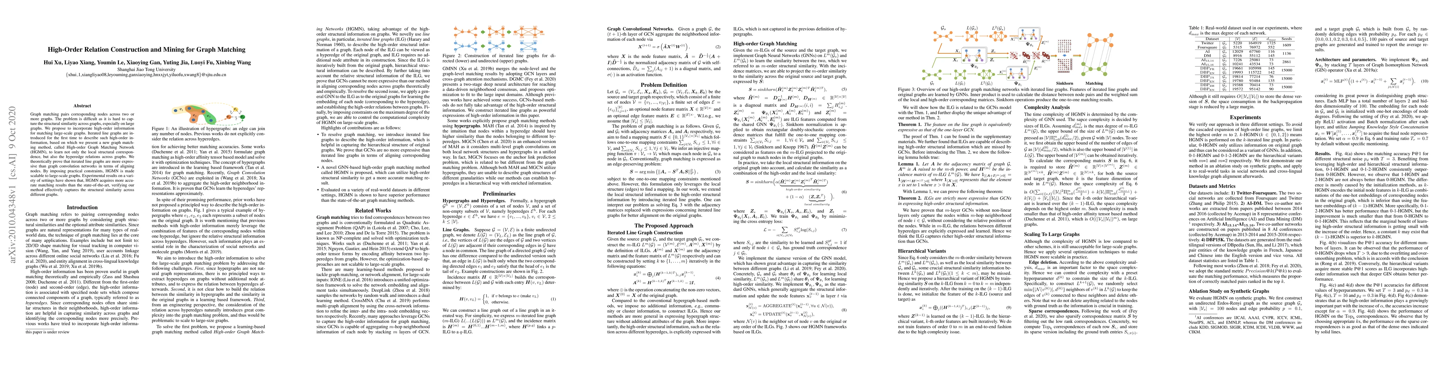Graph matching pairs corresponding nodes across two or more graphs. The problem is difficult as it is hard to capture the structural similarity across graphs, especially on large graphs. We propose to incorporate high-order information for matching large-scale graphs. Iterated line graphs are introduced for the first time to describe such high-order information, based on which we present a new graph matching method, called High-order Graph Matching Network (HGMN), to learn not only the local structural correspondence, but also the hyperedge relations across graphs. We theoretically prove that iterated line graphs are more expressive than graph convolution networks in terms of aligning nodes. By imposing practical constraints, HGMN is made scalable to large-scale graphs. Experimental results on a variety of settings have shown that, HGMN acquires more accurate matching results than the state-of-the-art, verifying our method effectively captures the structural similarity across different graphs.