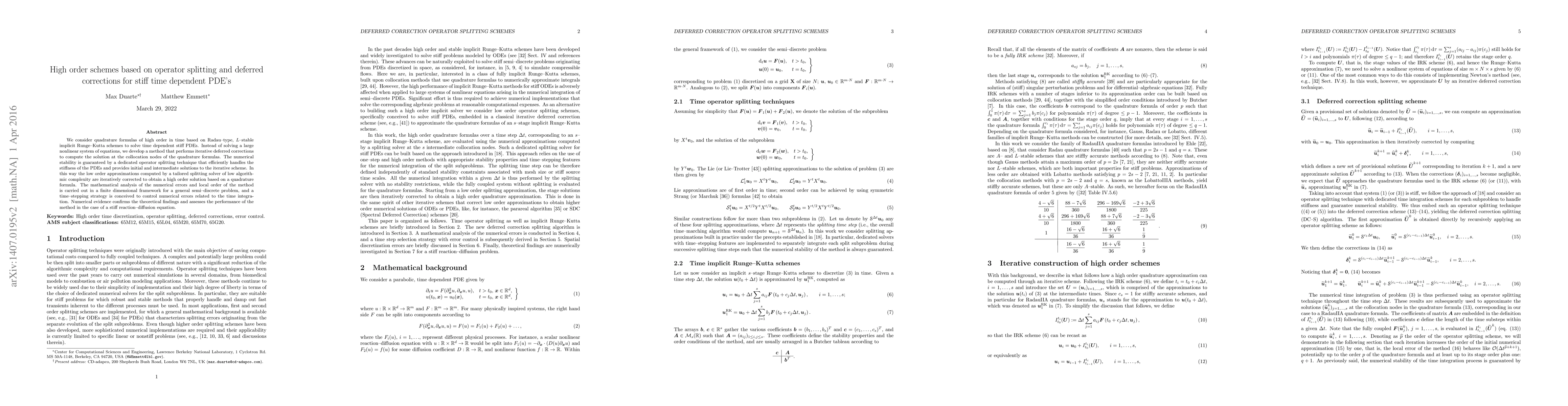 This paper proposes high-order numerical schemes based on operator splitting and deferred corrections for solving stiff time-dependent PDEs. It utilizes Radau-type implicit Runge-Kutta methods and iterative corrections to efficiently handle stiffness, demonstrating stability and accuracy through theoretical analysis and numerical experiments on a reaction-diffusion equation.