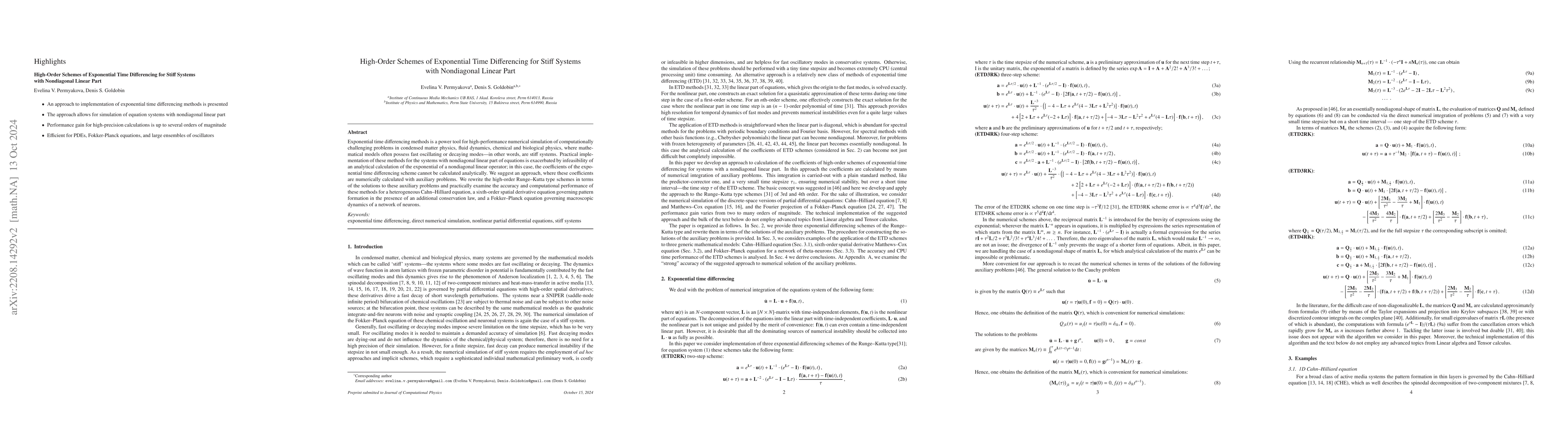 Exponential time differencing methods is a power toll for high-performance numerical simulation of computationally challenging problems in condensed matter and chemical physics, where mathematical models often possess fast oscillating or decaying modes -- in other words, are stiff systems. Practical implementation of these methods for the systems with nondiagonal linear part of equations is exacerbated by infeasibility of an analytical calculation of the exponential of a nondiagonal linear operator; in this case, the coefficients of the exponential time differencing scheme cannot be calculated analytically. We suggest an approach, where these coefficients are numerically calculated with auxiliary problems. We rewrite the high-order Runge--Kutta type schemes in terms of the solutions to these auxiliary problems and practically examine the accuracy and computational performance of these methods for a heterogeneous Cahn--Hilliard equation and a sixth-order spatial derivative equation governing pattern formation in the presence of an additional conservation law.